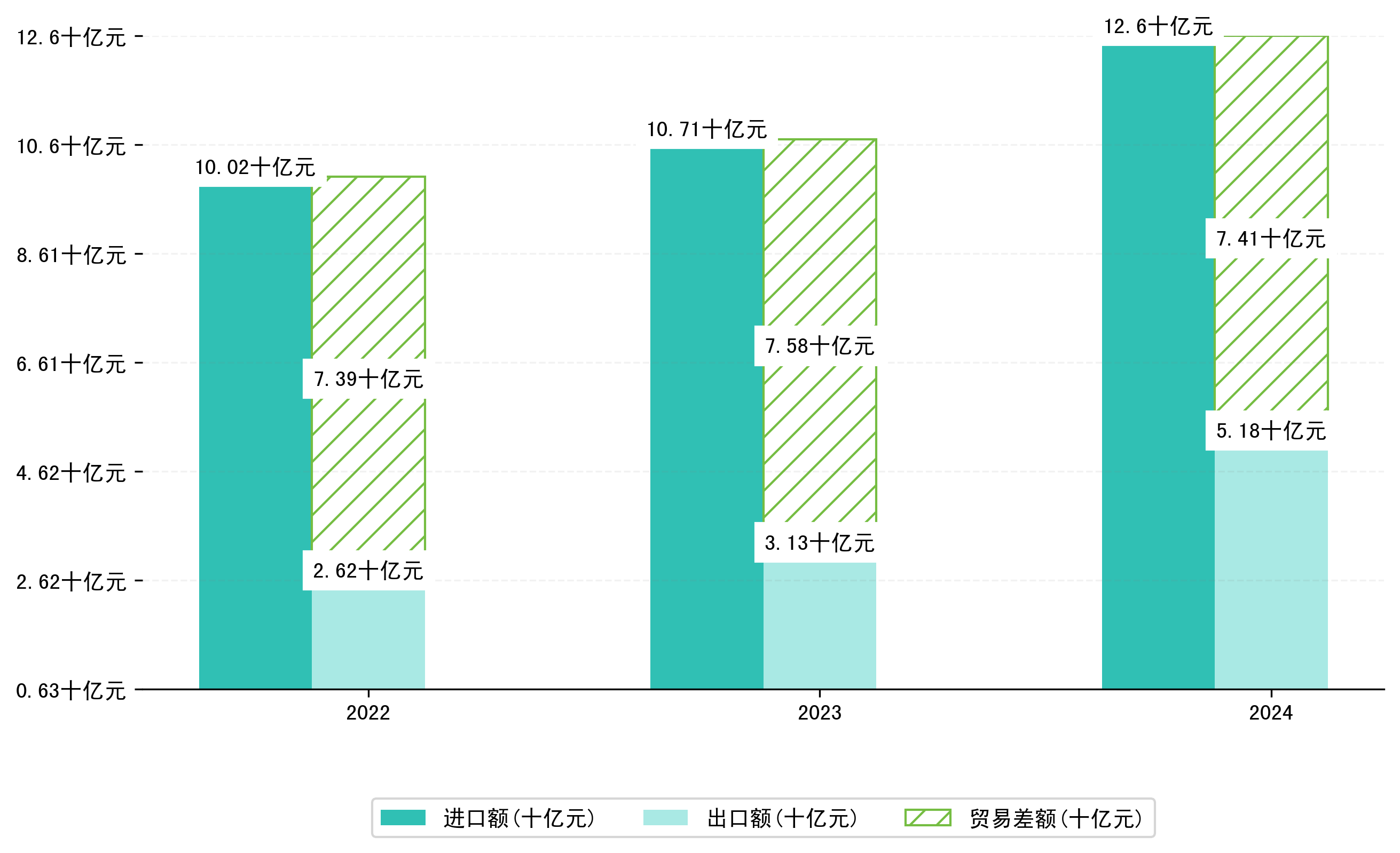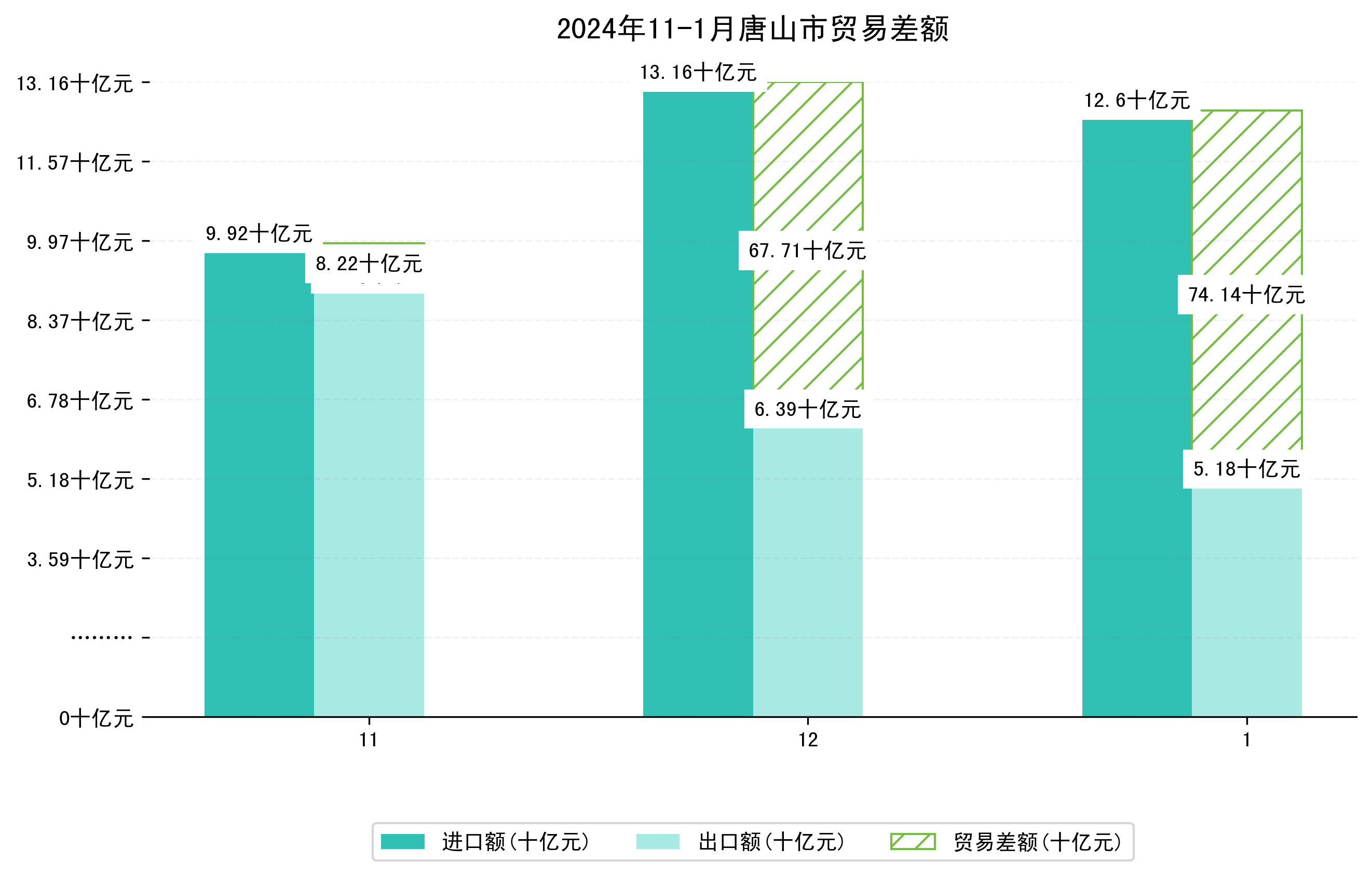 以人民币计,2024年1-1月唐山市贸易差额为74,1371,9149万元(贸易逆差),相比上年同期增加了1,6382,4392万元,同比增加-2.16%。