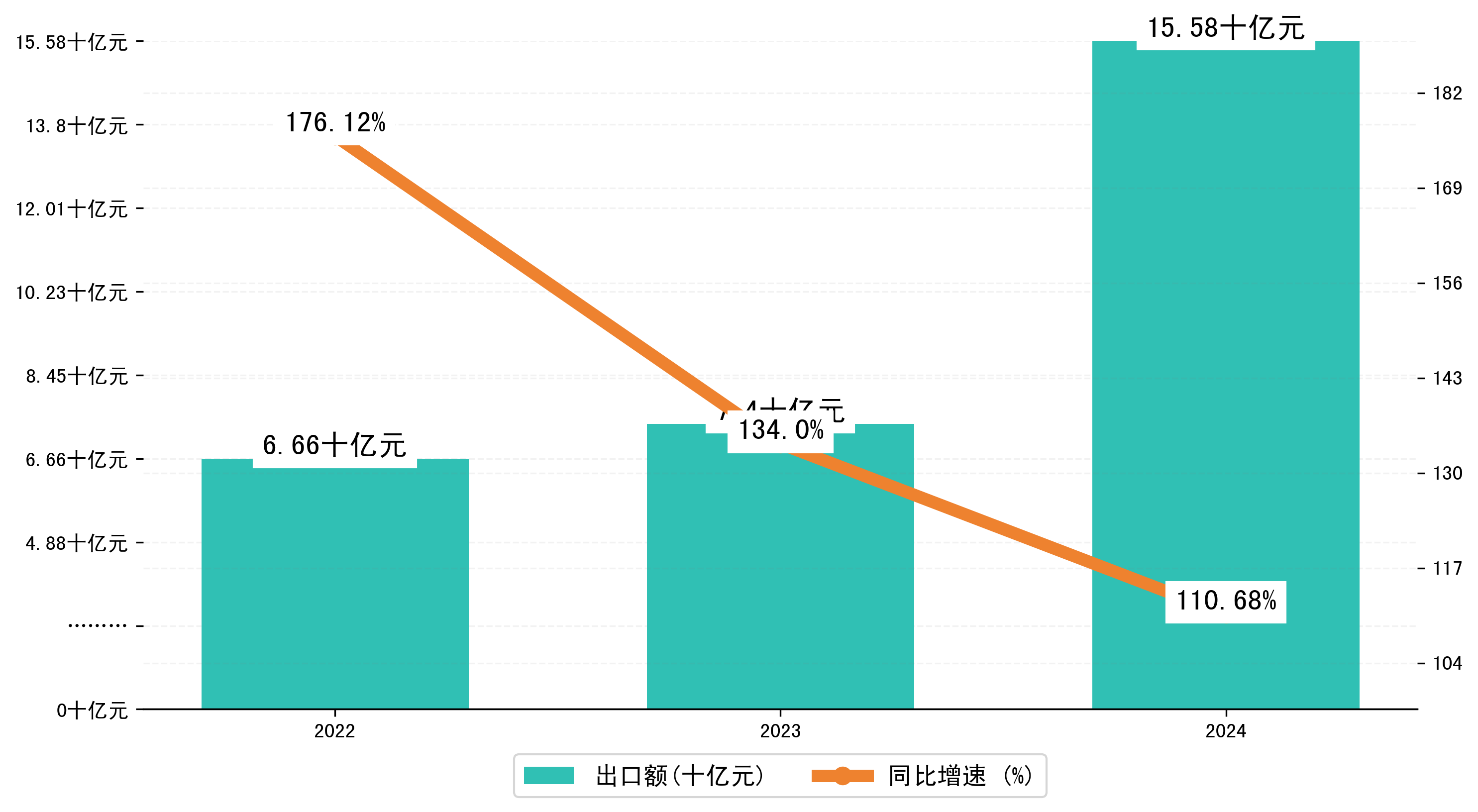 以人民币计,2024年1-10月铜陵市出口额为155,8471.4296万元,相比上年同期增加了81,8721.6885万元,同比增加了110.80%。