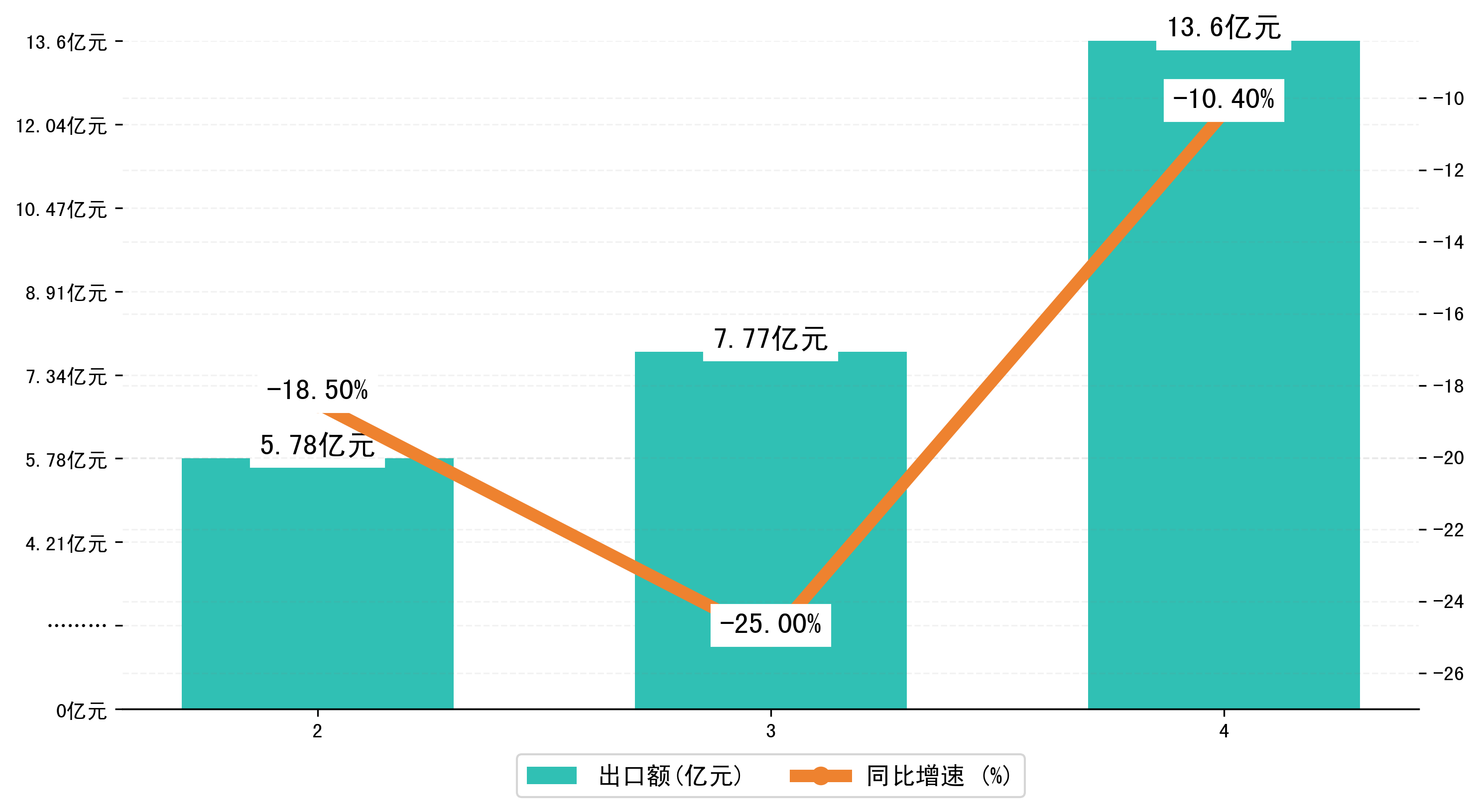 以美元计,2024年1-4月铜陵市出口额为4,6533.7774万美元,相比上年同期减少了7470.2921万美元,同比减少-13.70%。