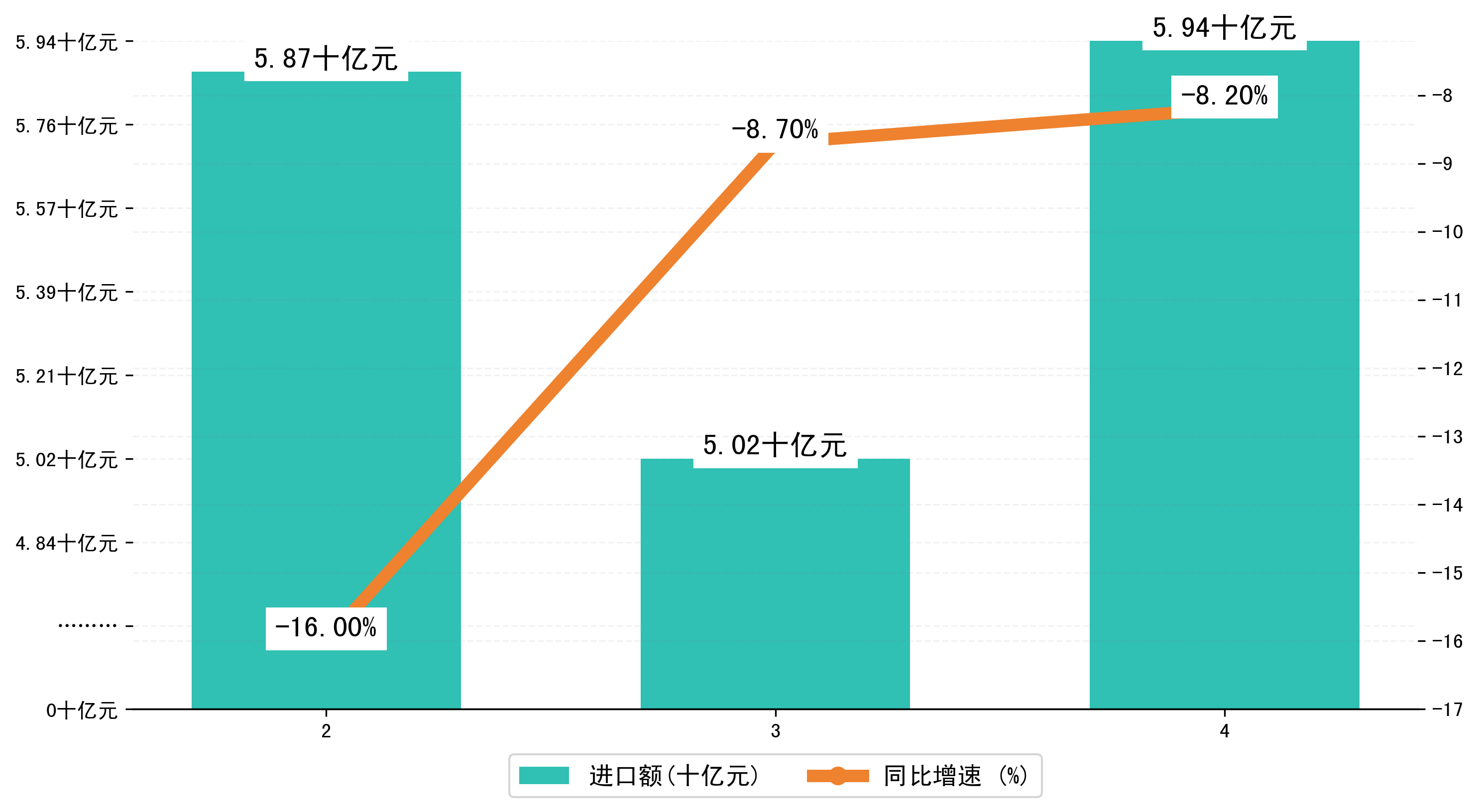 以人民币计,2024年1-4月铜陵市进口额为221,0652.8278万元,相比上年同期减少了20,9826.7942万元,同比减少了-8.20%。