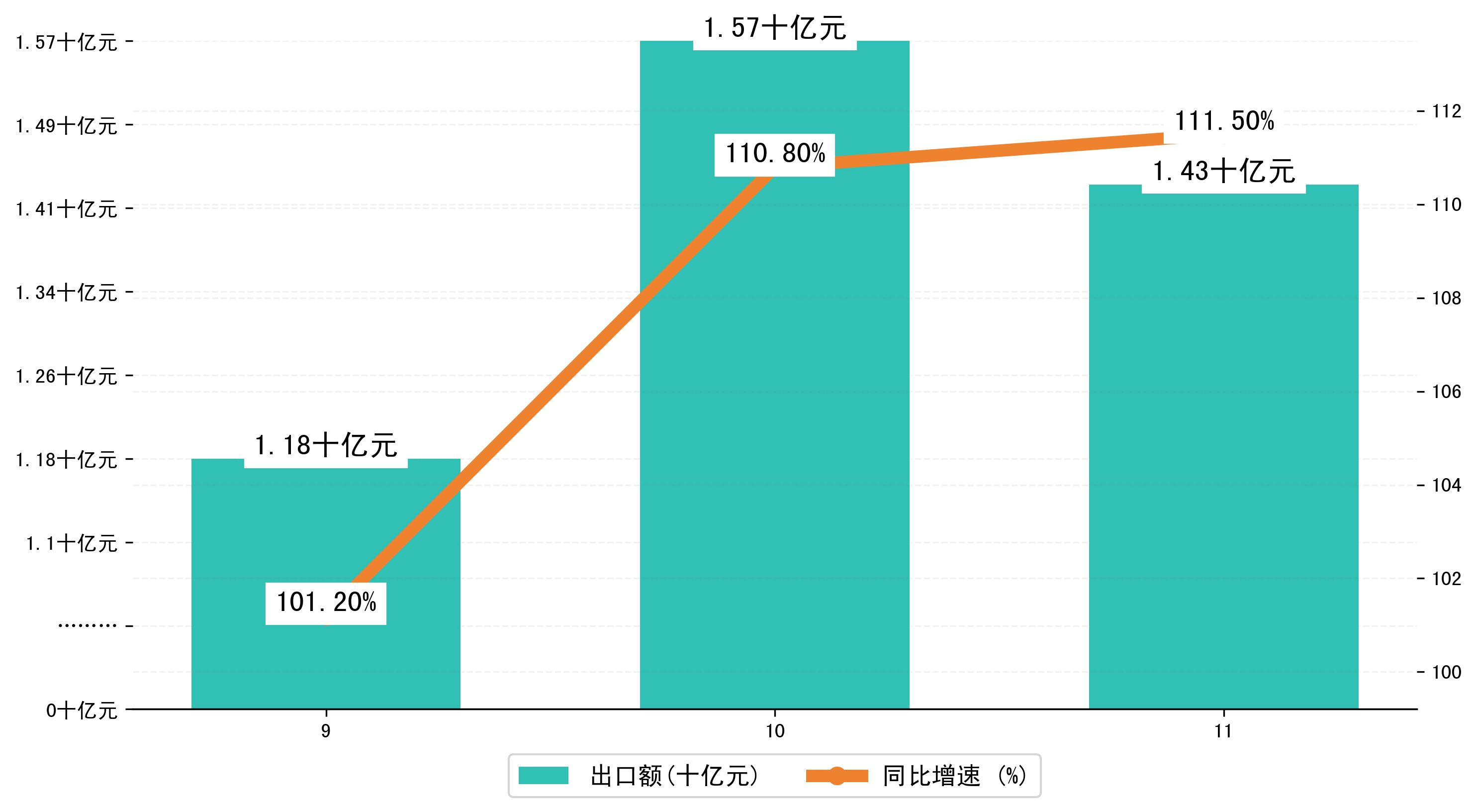 以人民币计,2024年11月铜陵市出口额为14,3357.1671万元,相比上月减少了1,3209.4496万元;相比上年同期增加了7,7792.5546万元,同比增加了111.50%。