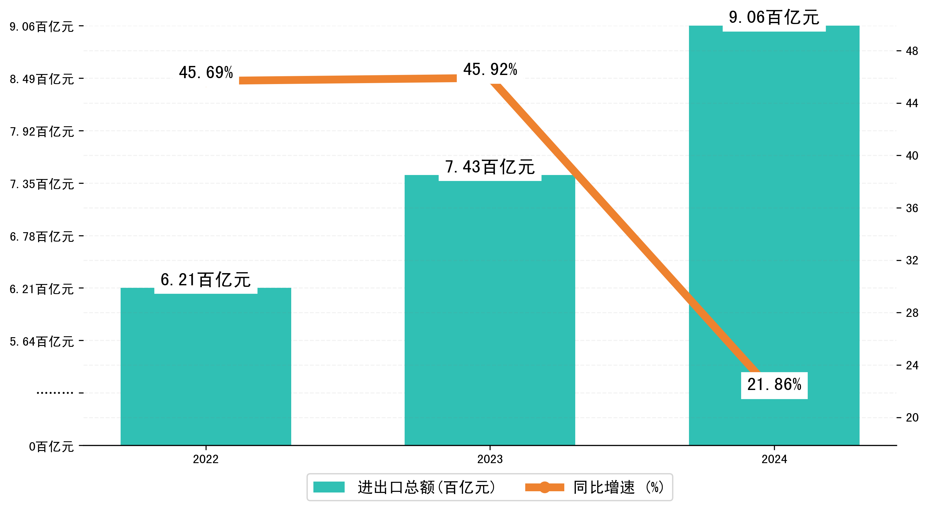 以人民币计,2024年1-11月铜陵市进出口总额为905,5550.5238万元,相比上年同期增加了162,4184.2238万元,同比增加了22.40%。