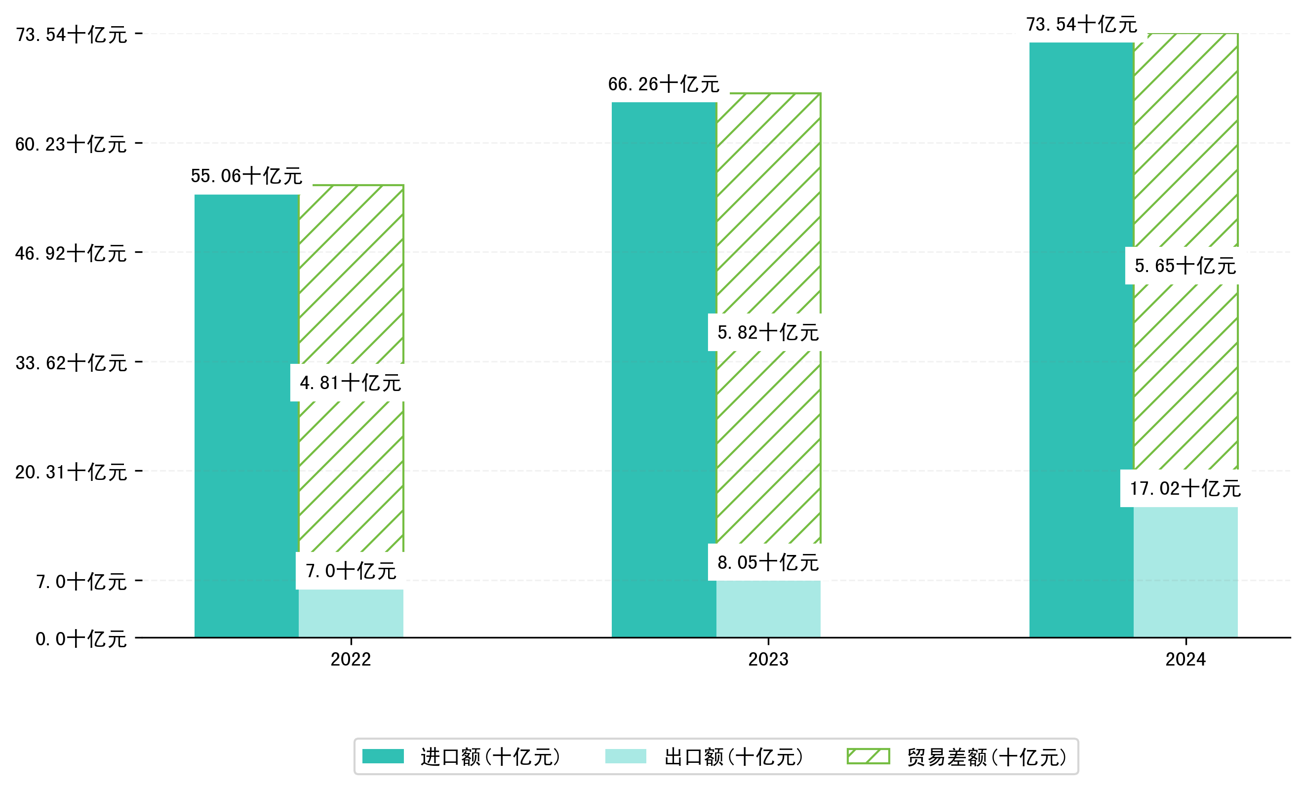 以人民币计,2024年1-11月铜陵市贸易差额为565,1893,3304万元(贸易逆差),相比上年同期增加了16,8868,7476万元,同比增加-2.9%。