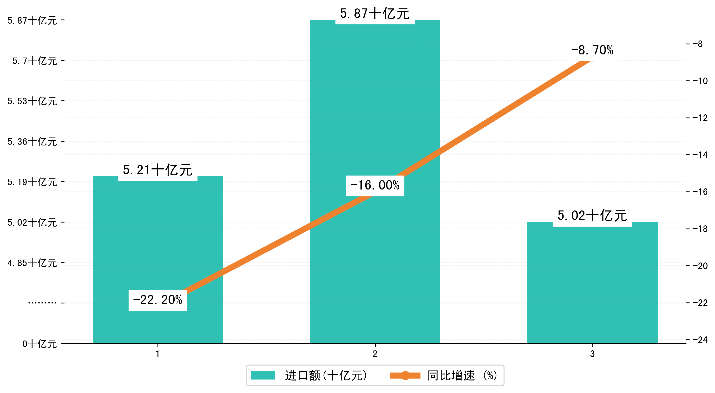 以美元计,2024年1-3月铜陵市进口额为22,6817.8283万美元,相比上年同期减少了2,5121.3223万美元,同比减少-11.90%。