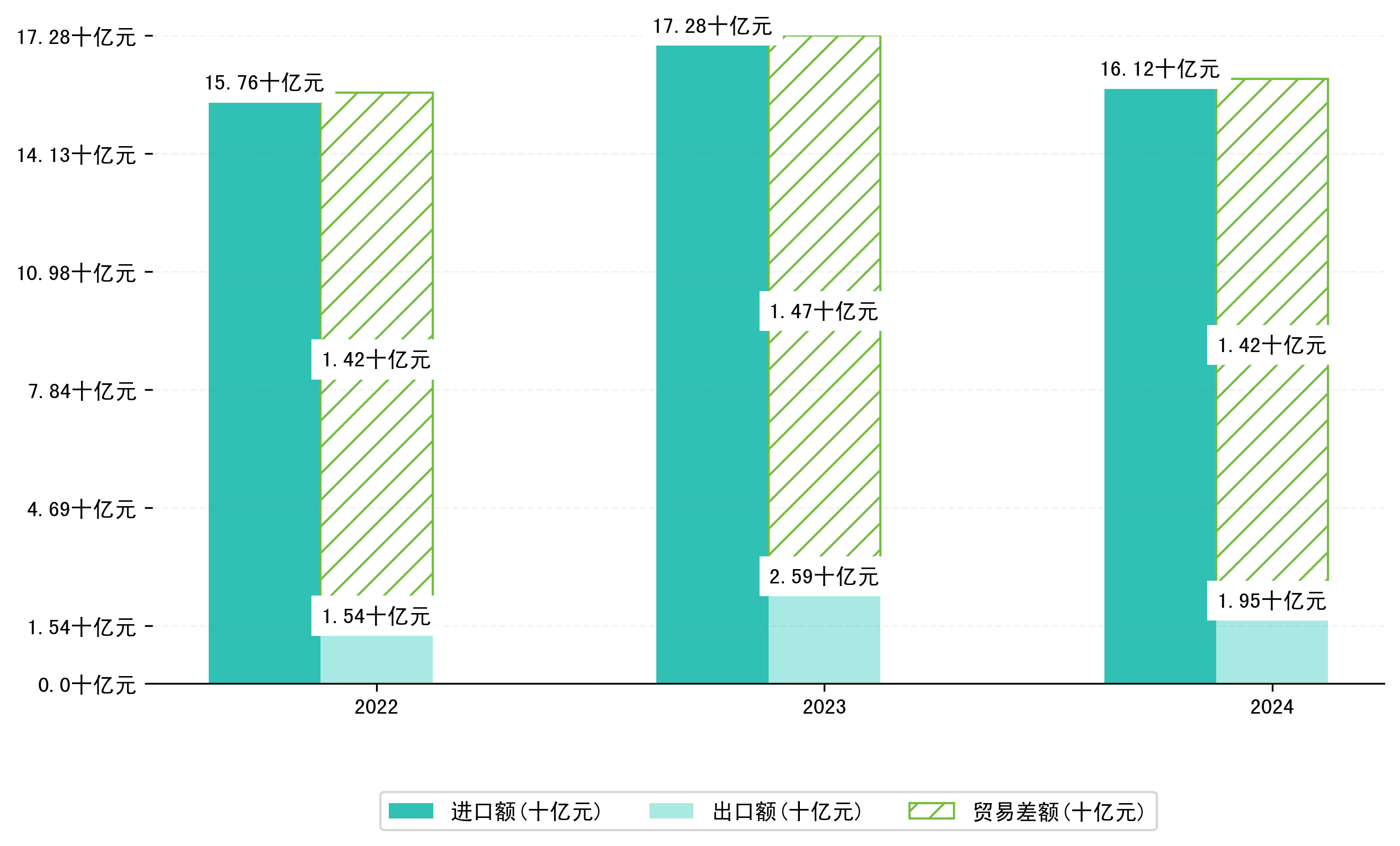 以人民币计,2024年1-3月铜陵市贸易差额为141,7803,9925万元(贸易逆差),相比上年同期增加了5,0673,5476万元,同比增加-3.45%。