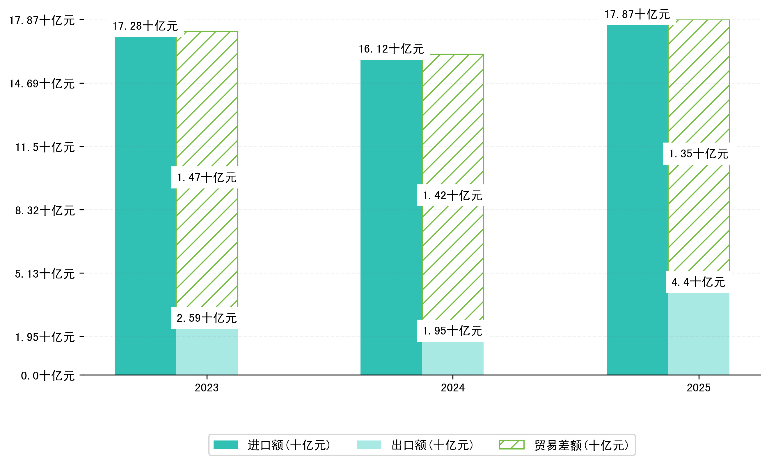 以美元计,2025年1-3月铜陵市贸易差额为18,7474,4609万美元(贸易逆差),相比上年同期增加了1,1965,6017万美元,同比增加-6.0%。