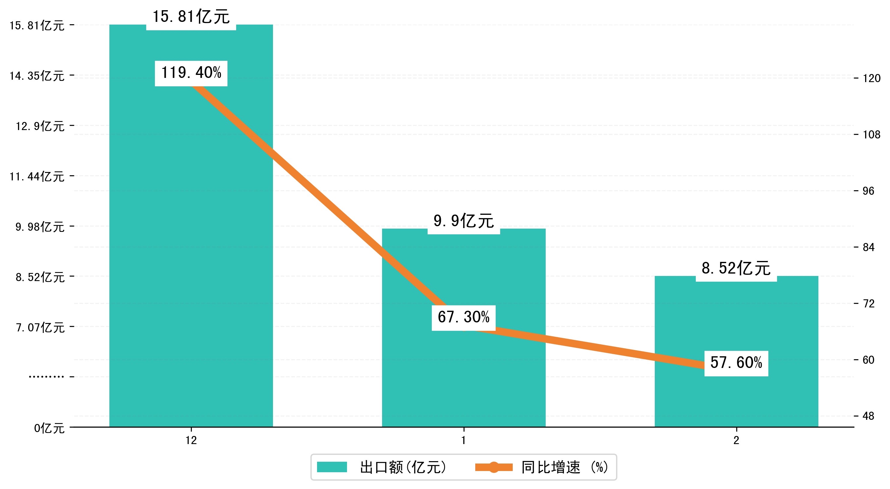 以人民币计,2025年1-2月铜陵市出口额为18,4219.575万元,相比上年同期增加了6,7305.4896万元,同比增加了57.60%。