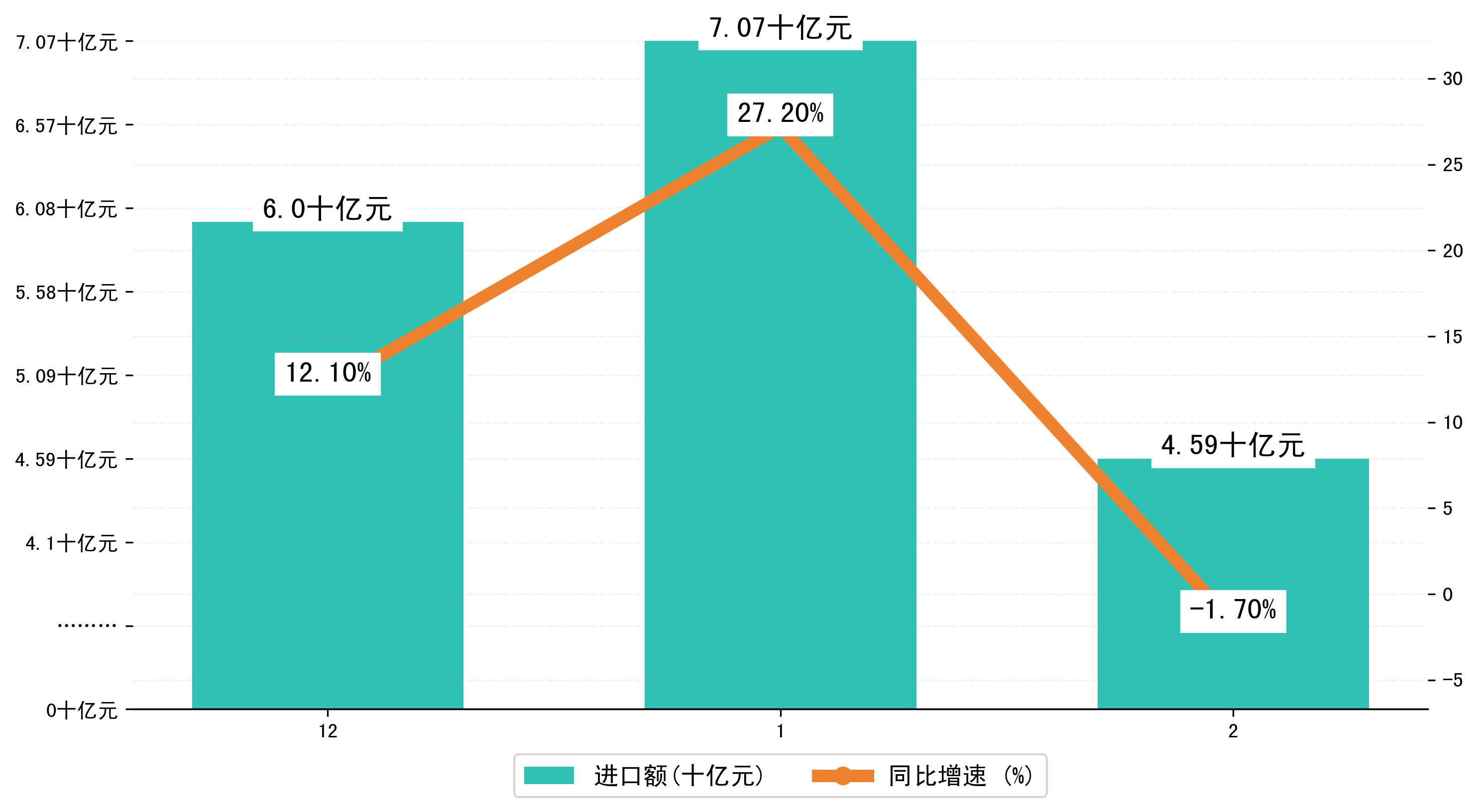 以人民币计,2025年2月铜陵市贸易差额为37,4157,4315万元(贸易逆差),相比上月增加了23,3621,6141万元,即3,2485,2130万美元;相比上年同期增加了15,5105,1906万元,同比增加-29.31%。