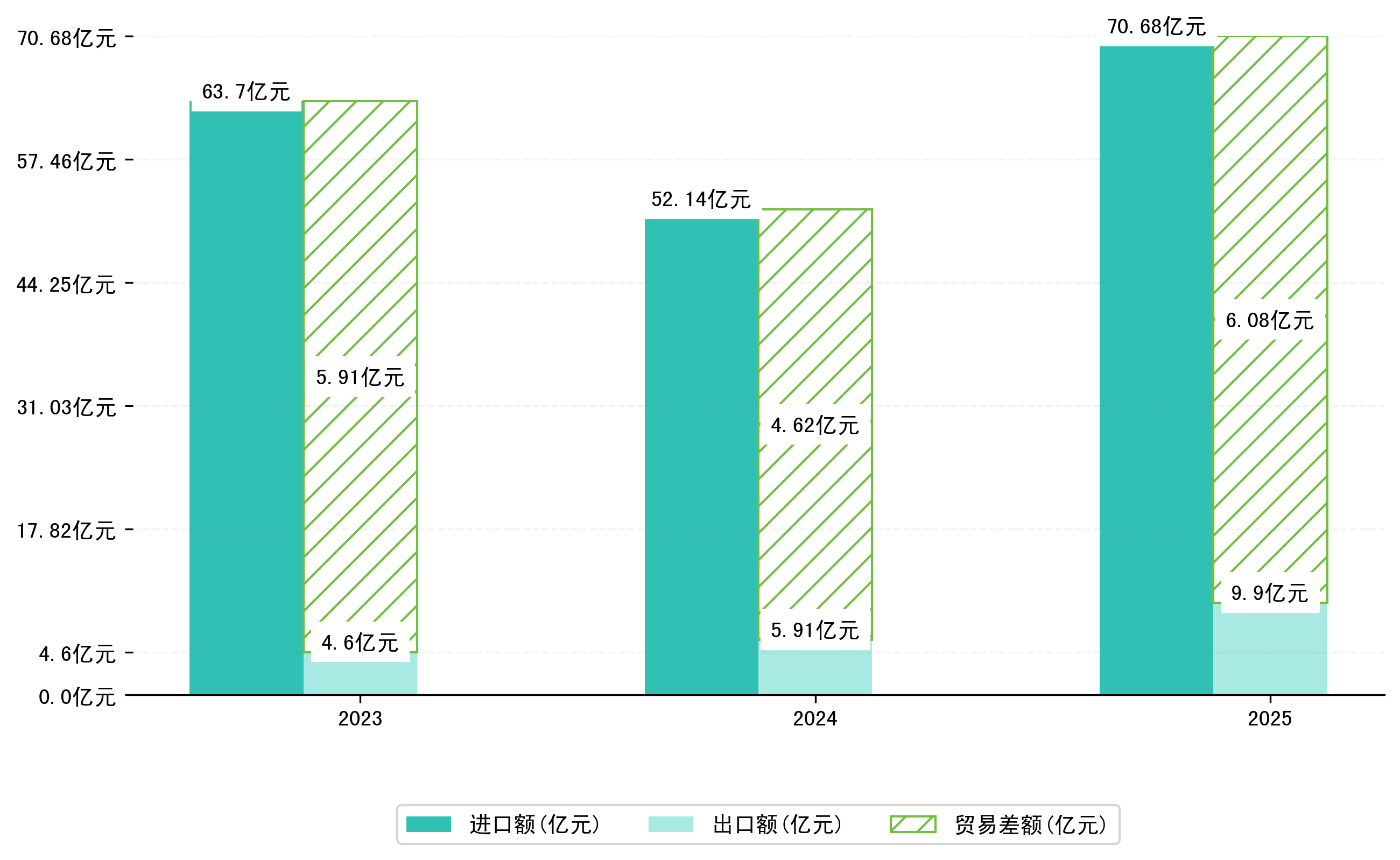 以人民币计,2025年1月铜陵市贸易差额为60,7779,0456万元(贸易逆差),相比上月减少了16,6310,7915万元,即2,3149,9601万美元;相比上年同期减少了14,5563,6586万元,同比减少31.49%。