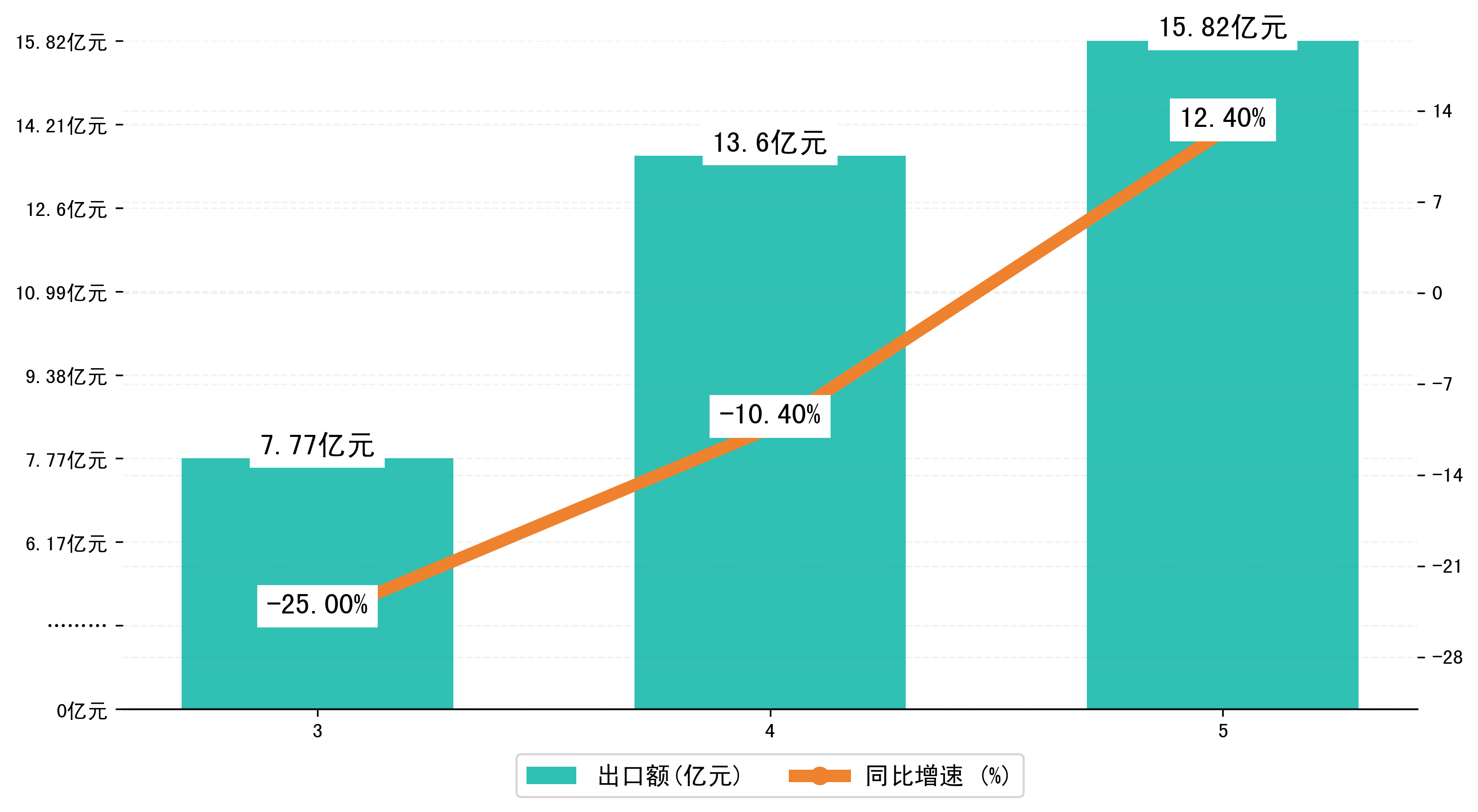 以人民币计,2024年5月铜陵市出口额为15,8196.2935万元,相比上月增加了2,2198.414万元;相比上年同期增加了9,2053.022万元,同比增加了12.40%。