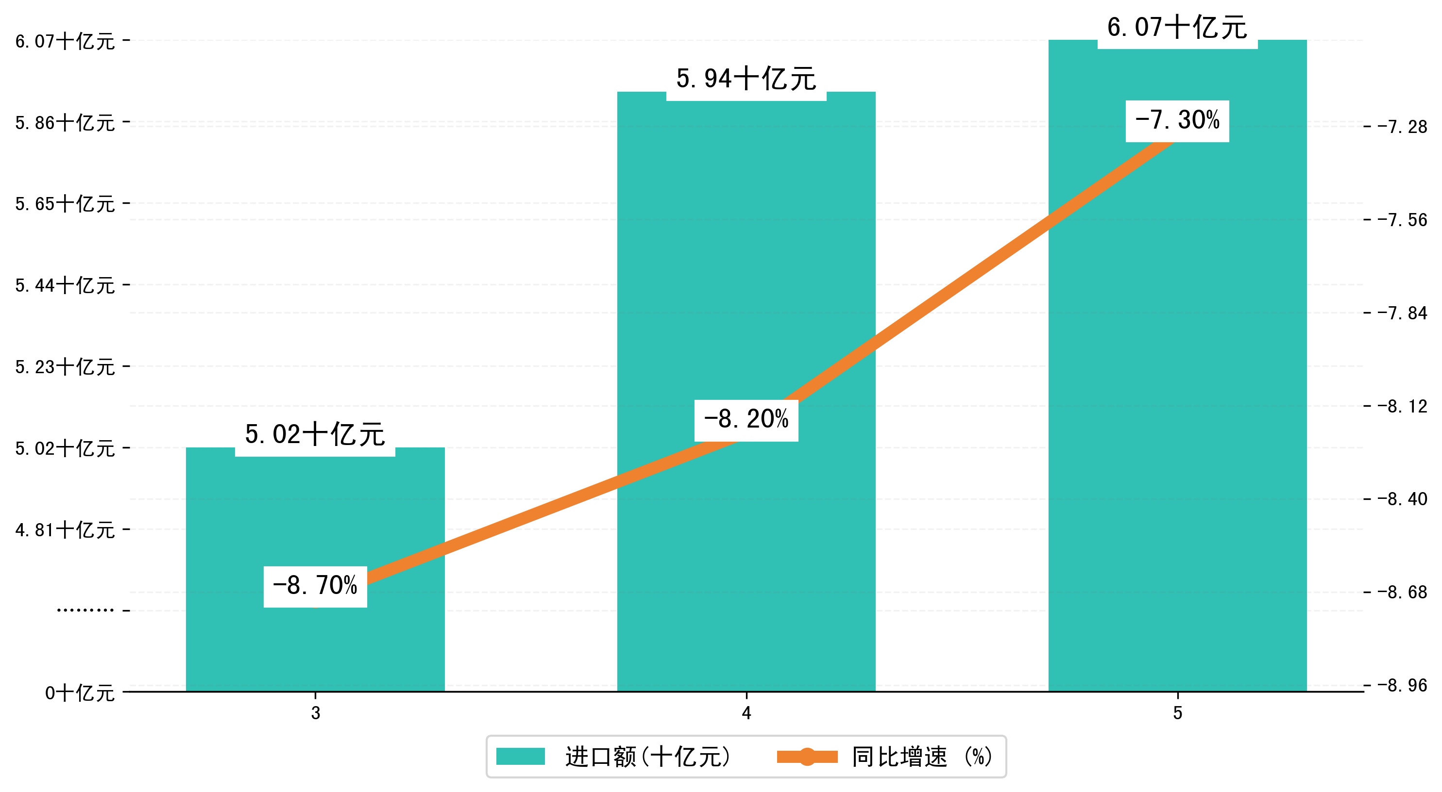 以人民币计,2024年5月铜陵市进口额为60,7164.6385万元,相比上月增加了1,3320.7925万元;相比上年同期减少了8,4948.8304万元,同比减少了-7.30%。