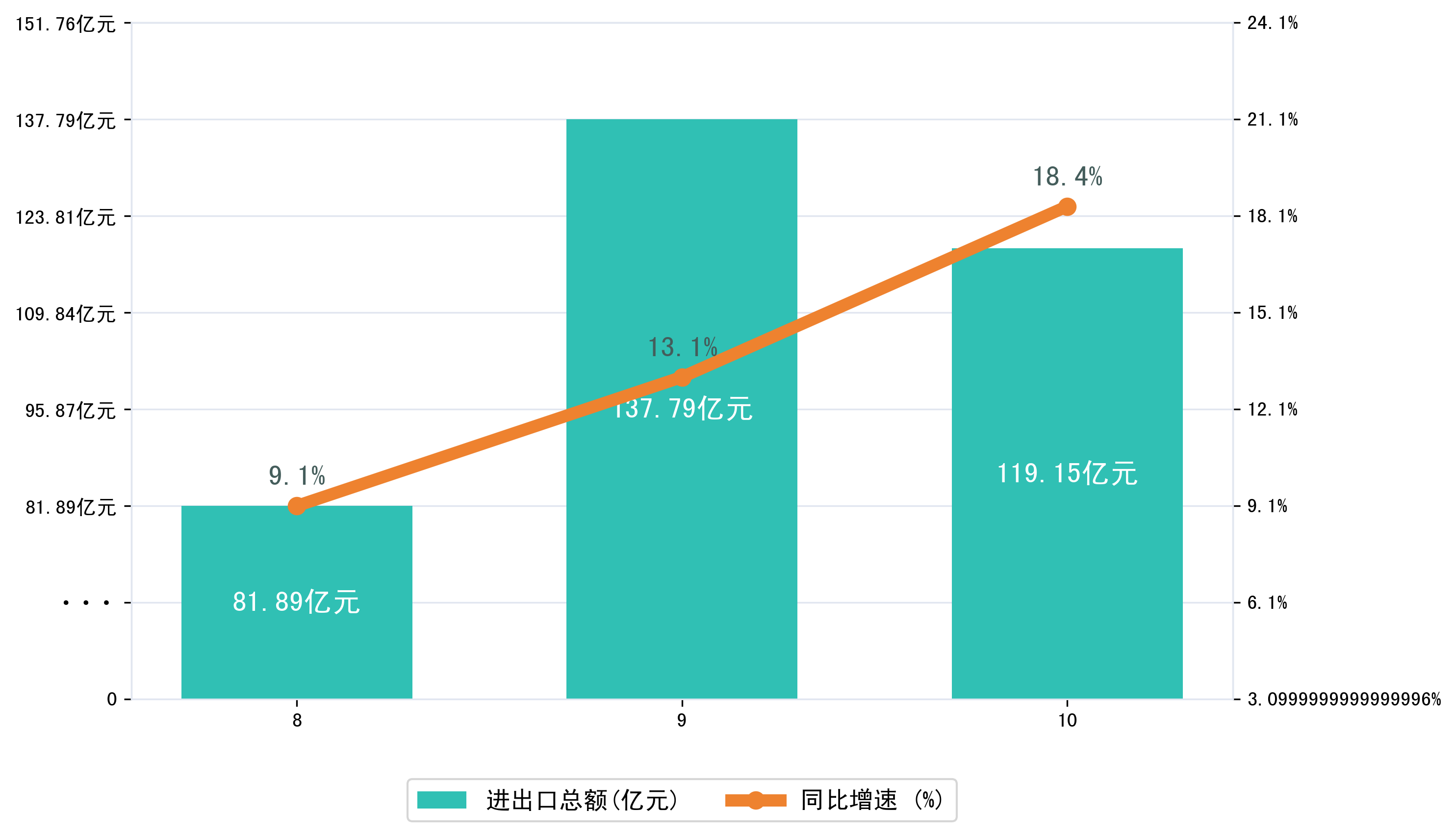以人民币计,2025年10月铜陵市进出口总额为119,1469.2198万元,相比上月减少了18,6381.8907万元;相比上年同期增加了51,1033.5572万元,同比增加了18.40%。