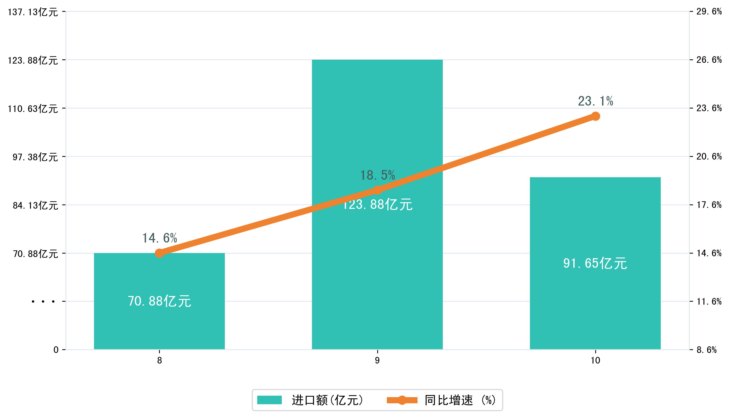 以人民币计,2025年10月铜陵市进口额为91,6548.4274万元,相比上月减少了32,2228.5832万元;相比上年同期增加了39,2679.3815万元,同比增加了23.10%。