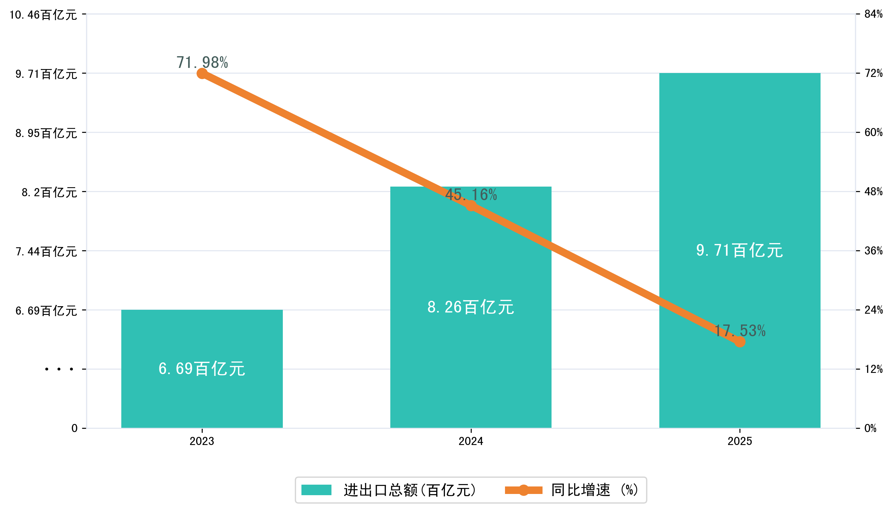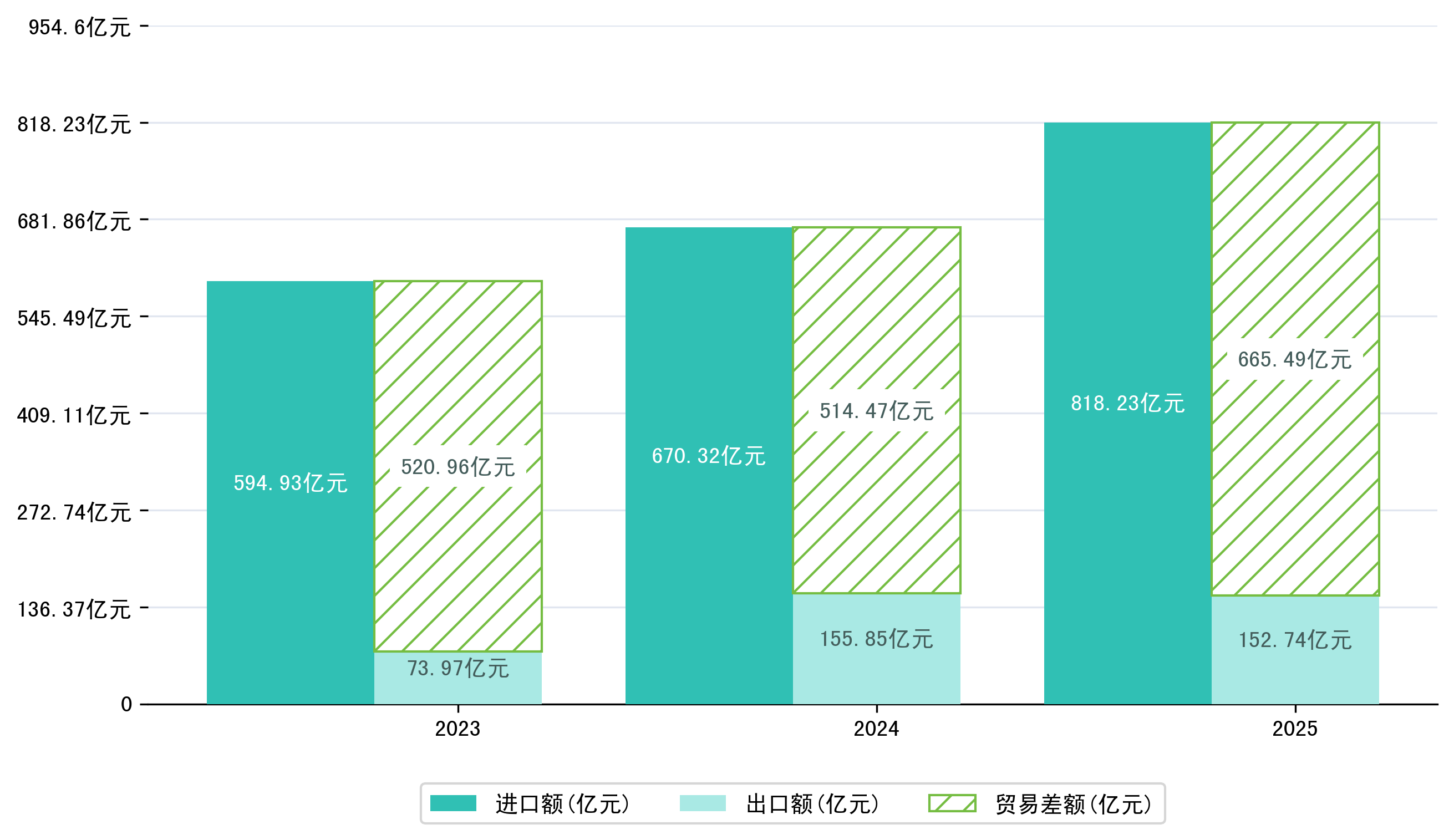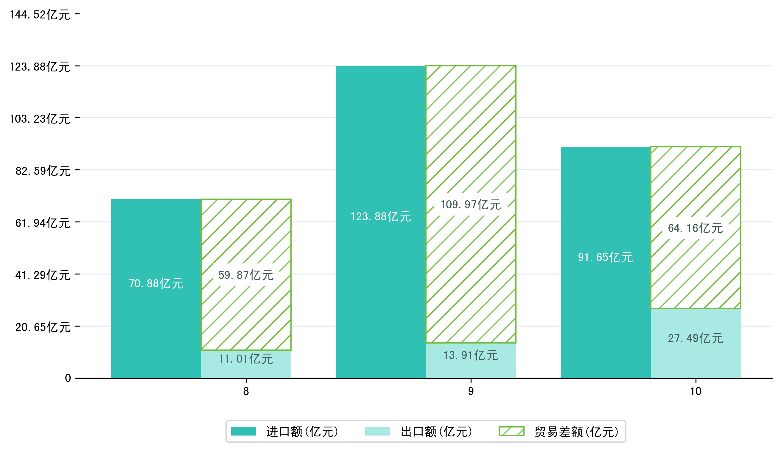 以美元计,2025年10月铜陵市贸易差额为9,0188,7317万美元(贸易逆差),相比上月增加了6,3869,7711万美元;相比上年同期减少了3,8383,2119万美元,同比减少74.09%。