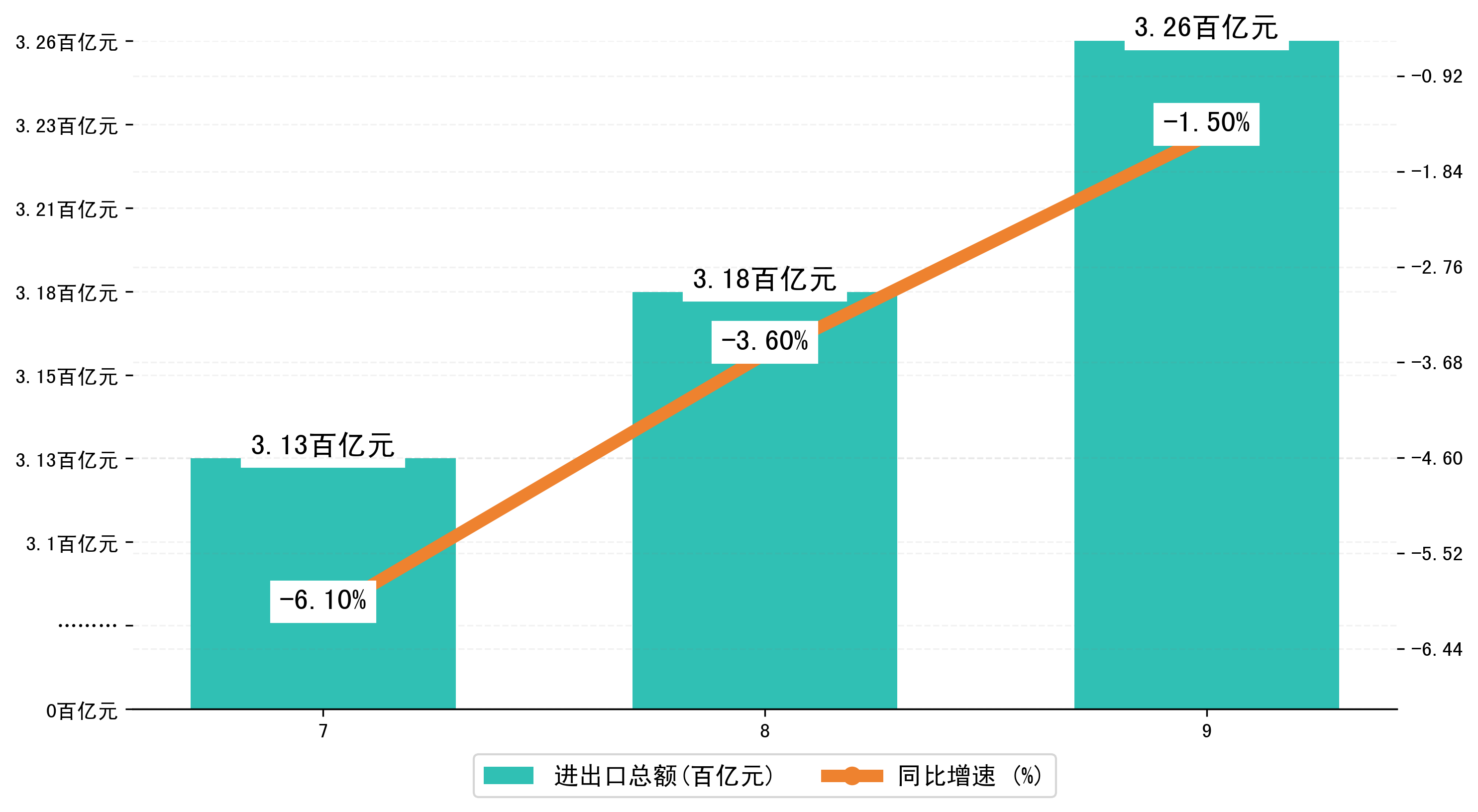 以人民币计,2023年9月潍坊市进出口总额为326,0944.4498万元,相比上月增加了8,0484.0827万元;相比上年同期增加了43,9404.1617万元,同比减少了-1.50%。
