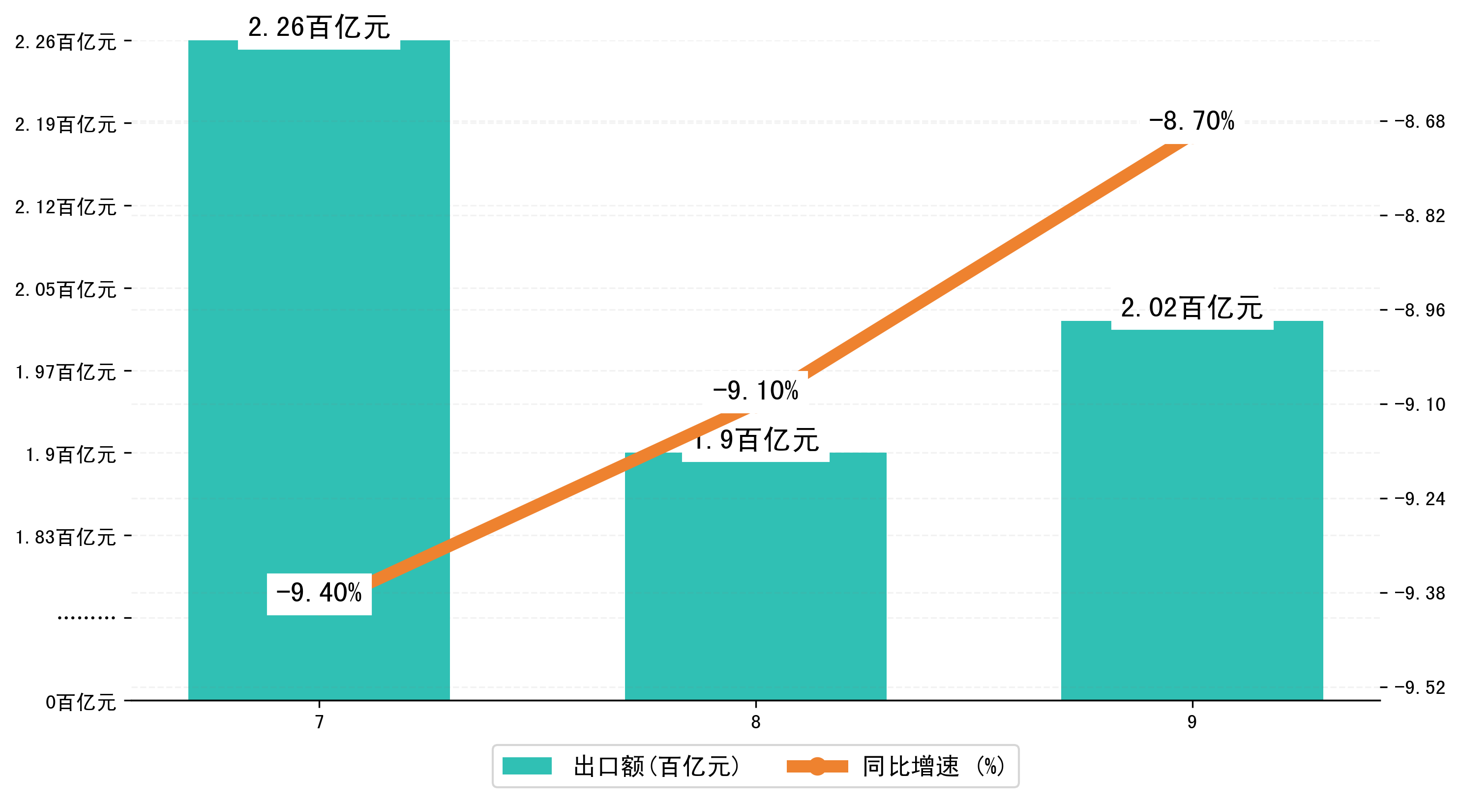 以人民币计,2023年9月潍坊市出口额为201,7138.1144万元,相比上月增加了11,3734.8456万元;相比上年同期减少了11,5461.6681万元,同比减少了-8.70%。