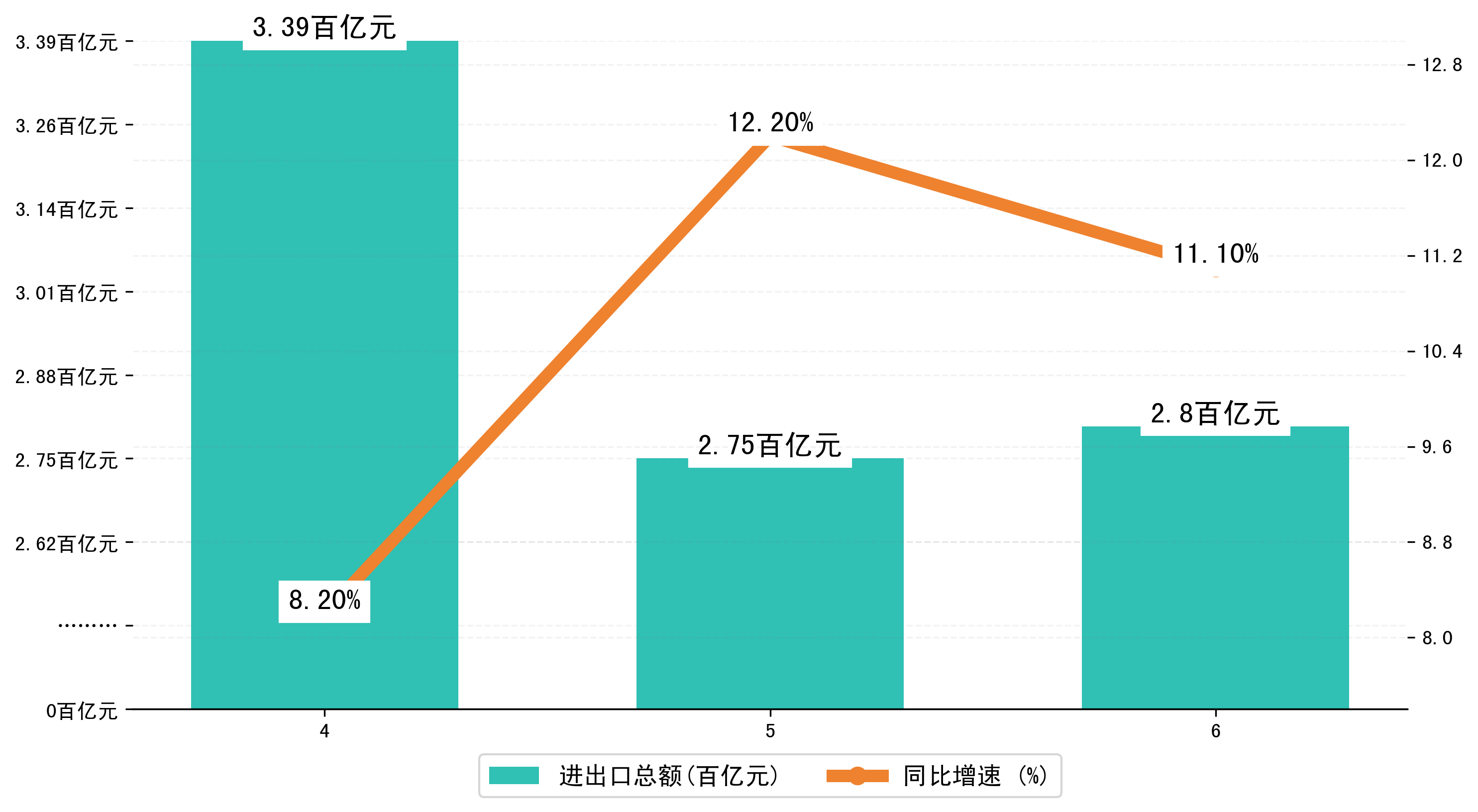 以人民币计,2024年6月潍坊市进出口总额为280,0644.6381万元,相比上月增加了4,9181.6562万元;相比上年同期增加了13,9377.3925万元,同比增加了11.10%。