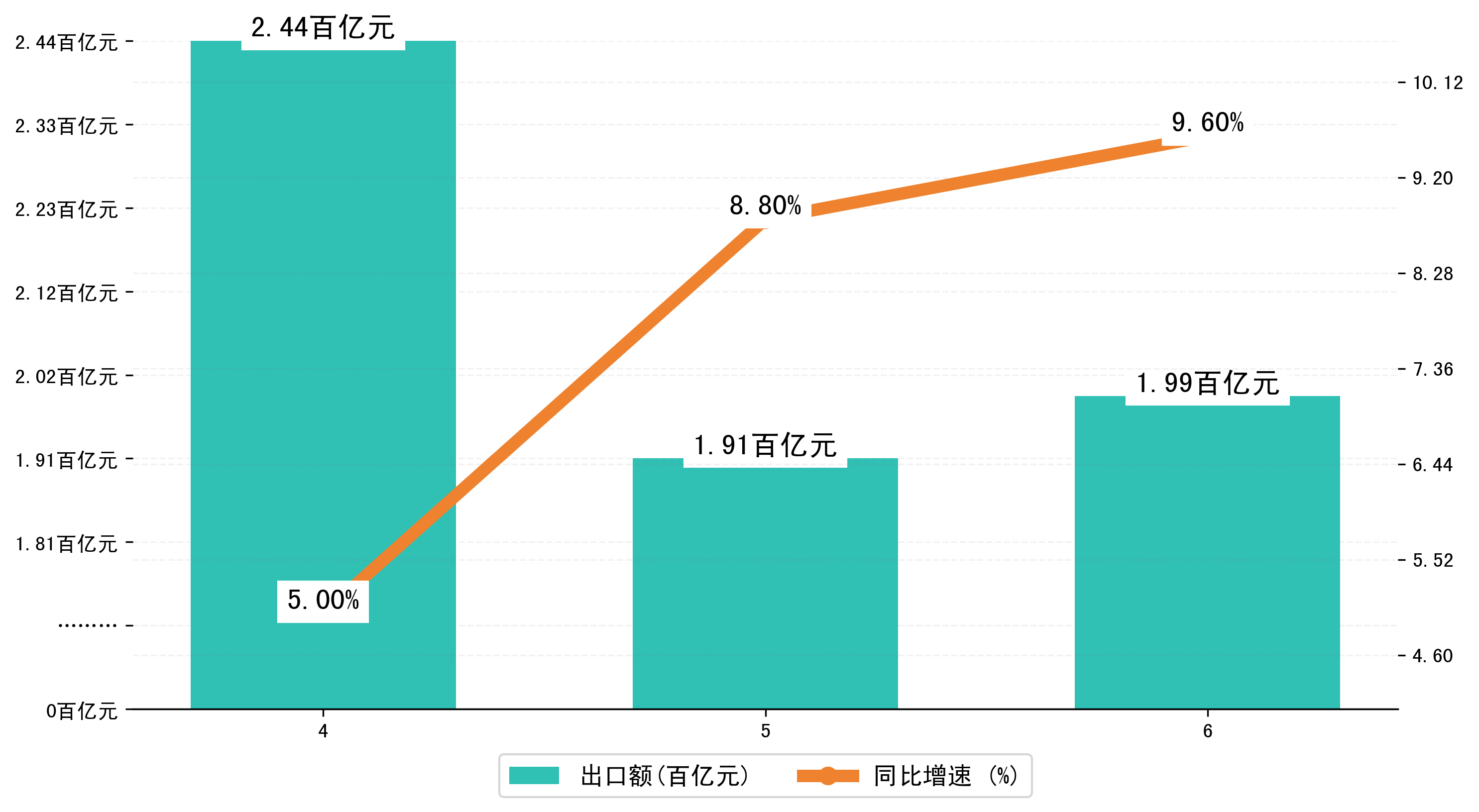以人民币计,2024年1-6月潍坊市出口额为1194,1000.0757万元,相比上年同期增加了99,5689.4736万元,同比增加了9.60%。