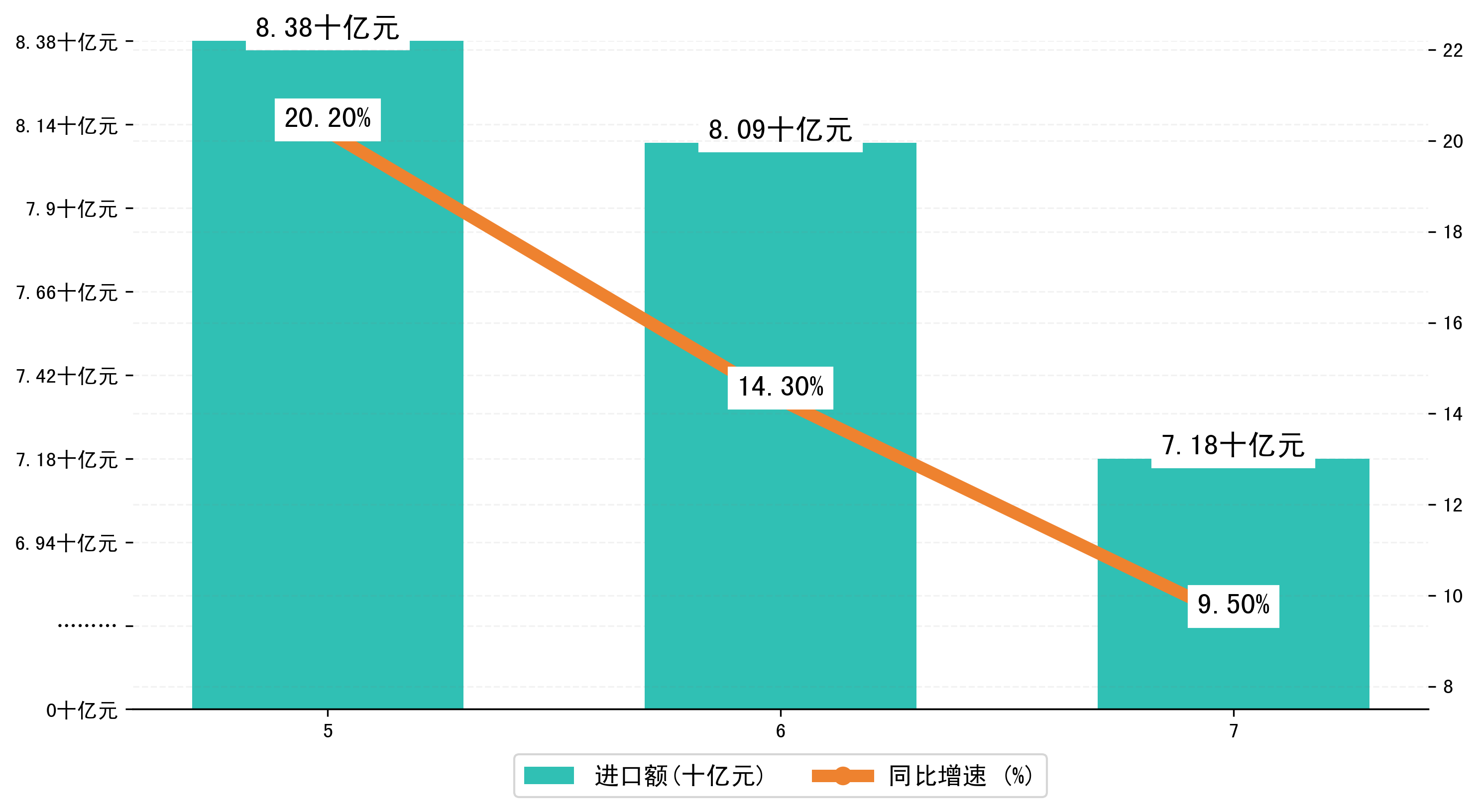 以人民币计,2024年7月潍坊市进口额为71,8287.5115万元,相比上月减少了9,0249.2993万元;相比上年同期减少了15,0357.7875万元,同比增加了9.50%。