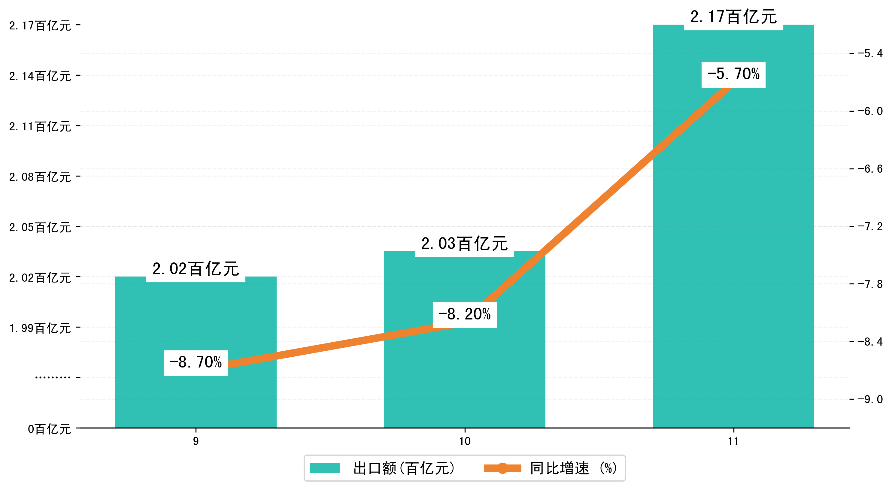 以人民币计,2023年11月潍坊市出口额为216,6125.127万元,相比上月增加了13,4021.6245万元;相比上年同期增加了42,5342.3576万元,同比减少了-5.70%。