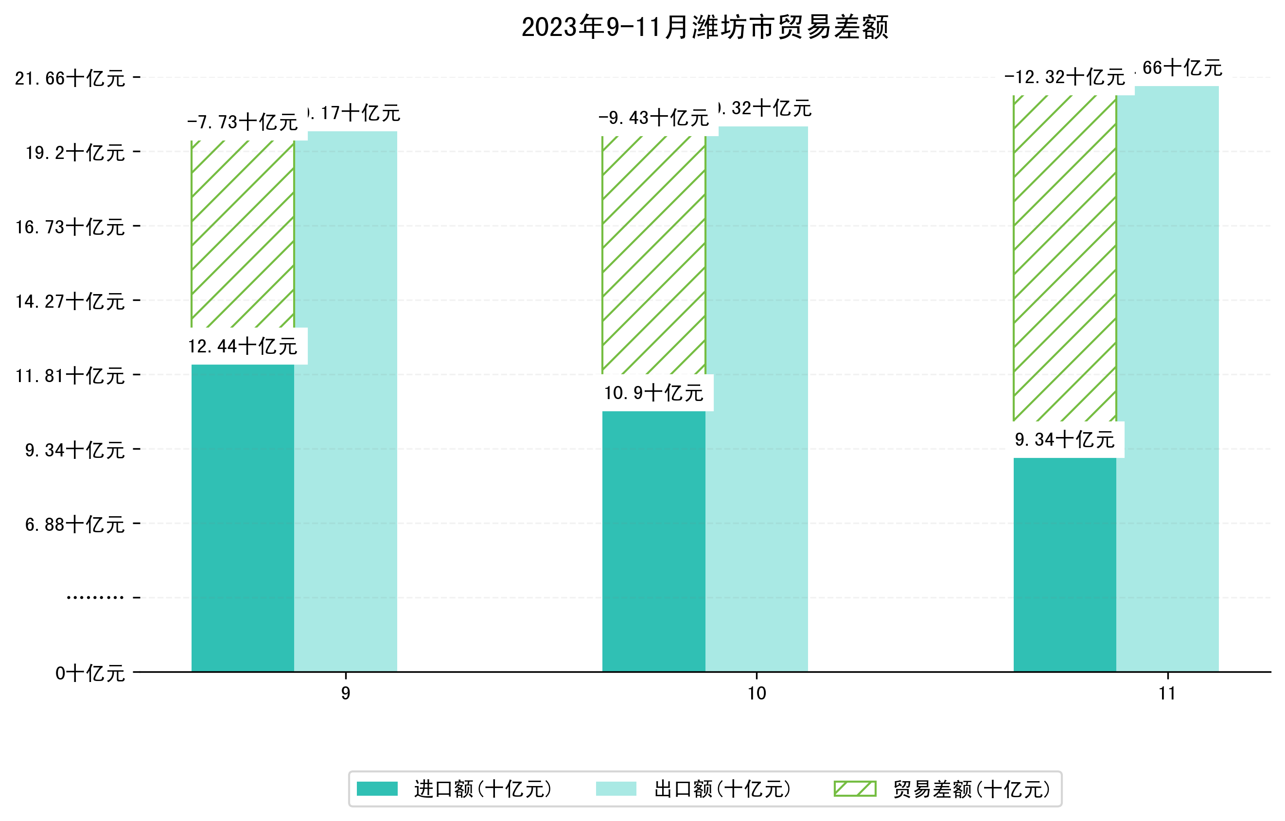 以人民币计,2023年11月潍坊市贸易差额为123,1825,9275万元(贸易顺差),相比上月增加了28,9317,3137万元,即4,0215,6143万美元;相比上年同期增加了36,3951,3726万元,同比增加41.94%。