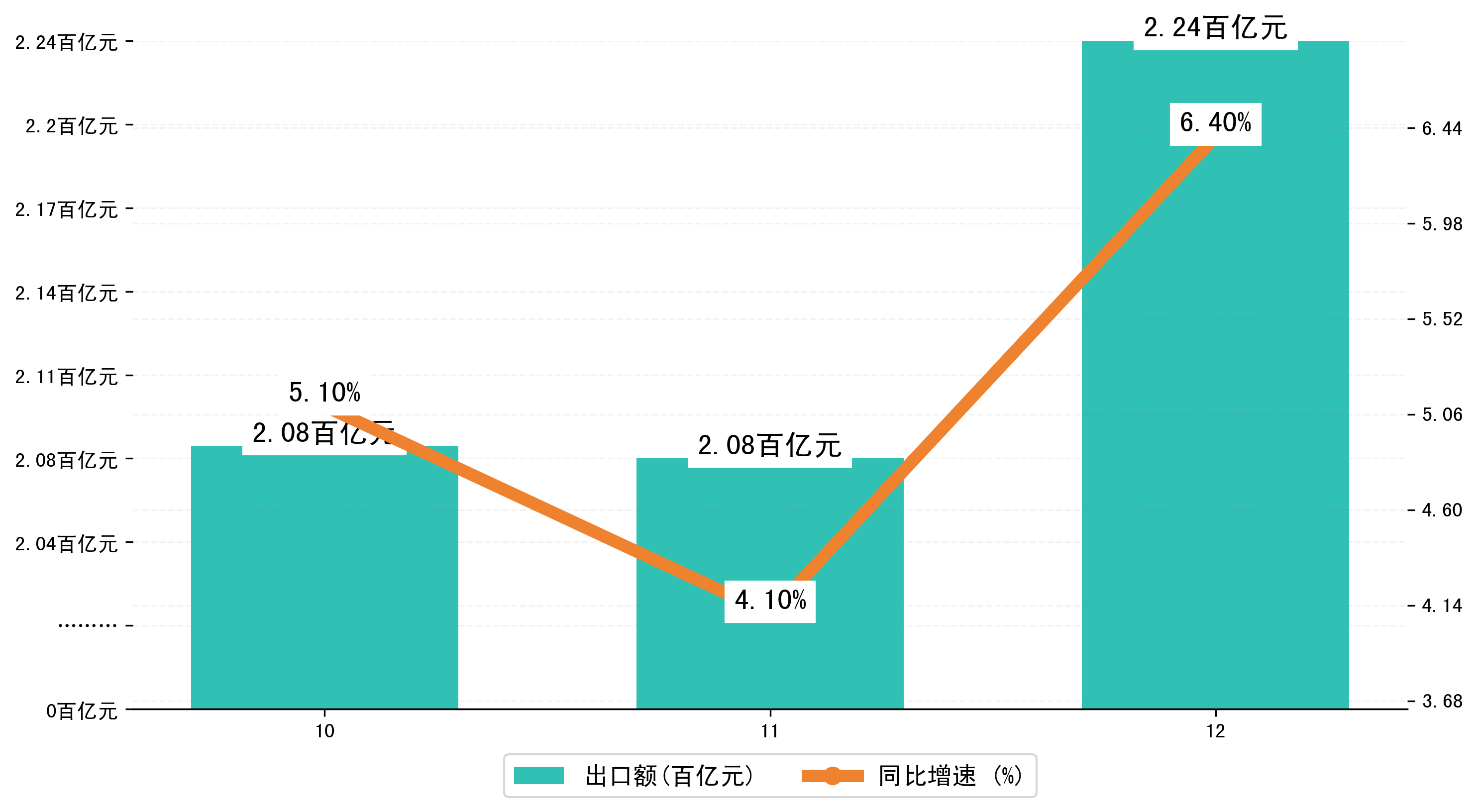 以人民币计,2024年12月潍坊市出口额为223,5984.1767万元,相比上月增加了16,0111.488万元;相比上年同期增加了48,0249.2885万元,同比增加了6.40%。