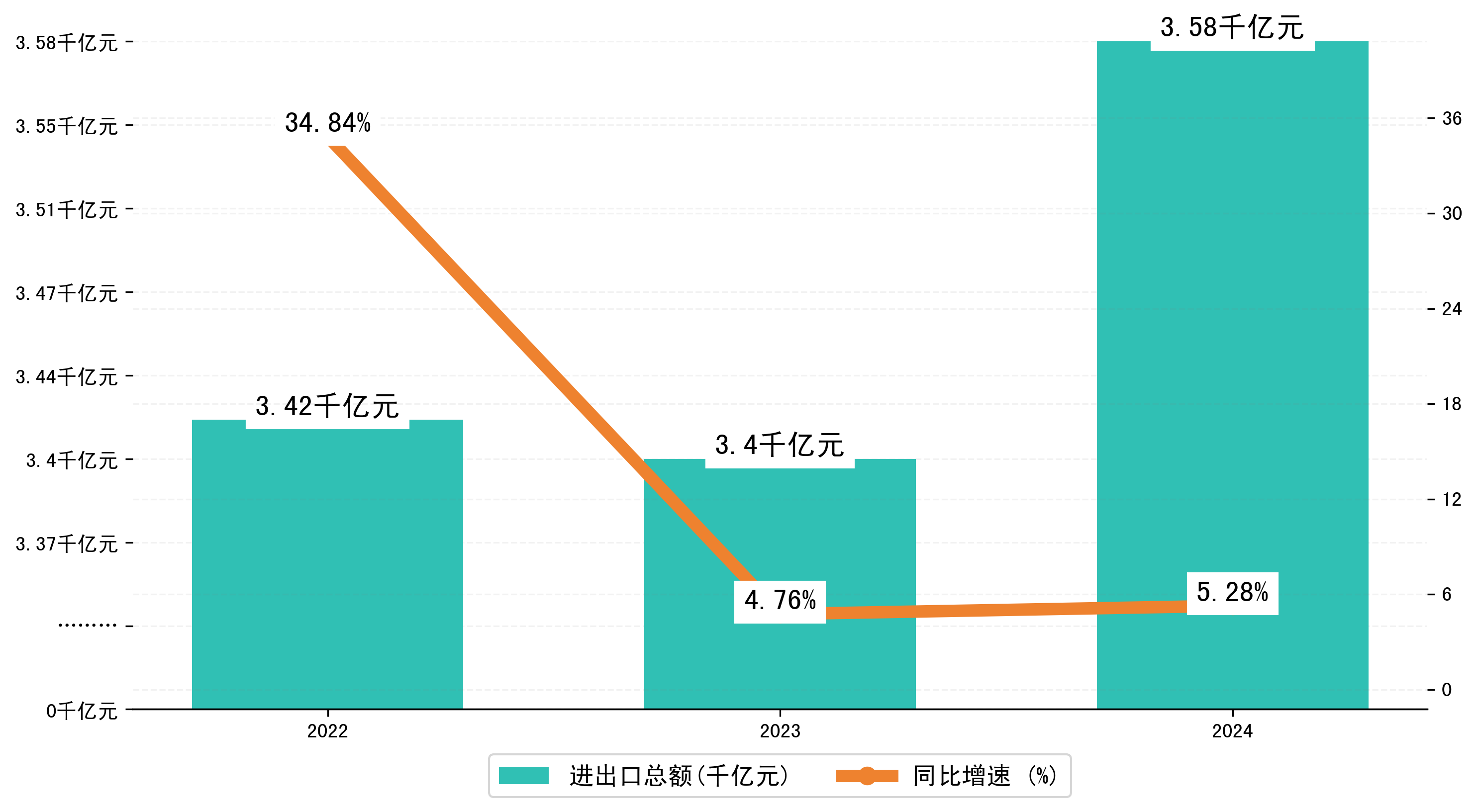 以人民币计,2024年1-12月潍坊市进出口总额为3582,7438.2745万元,相比上年同期增加了179,6093.9024万元,同比增加了5.20%。