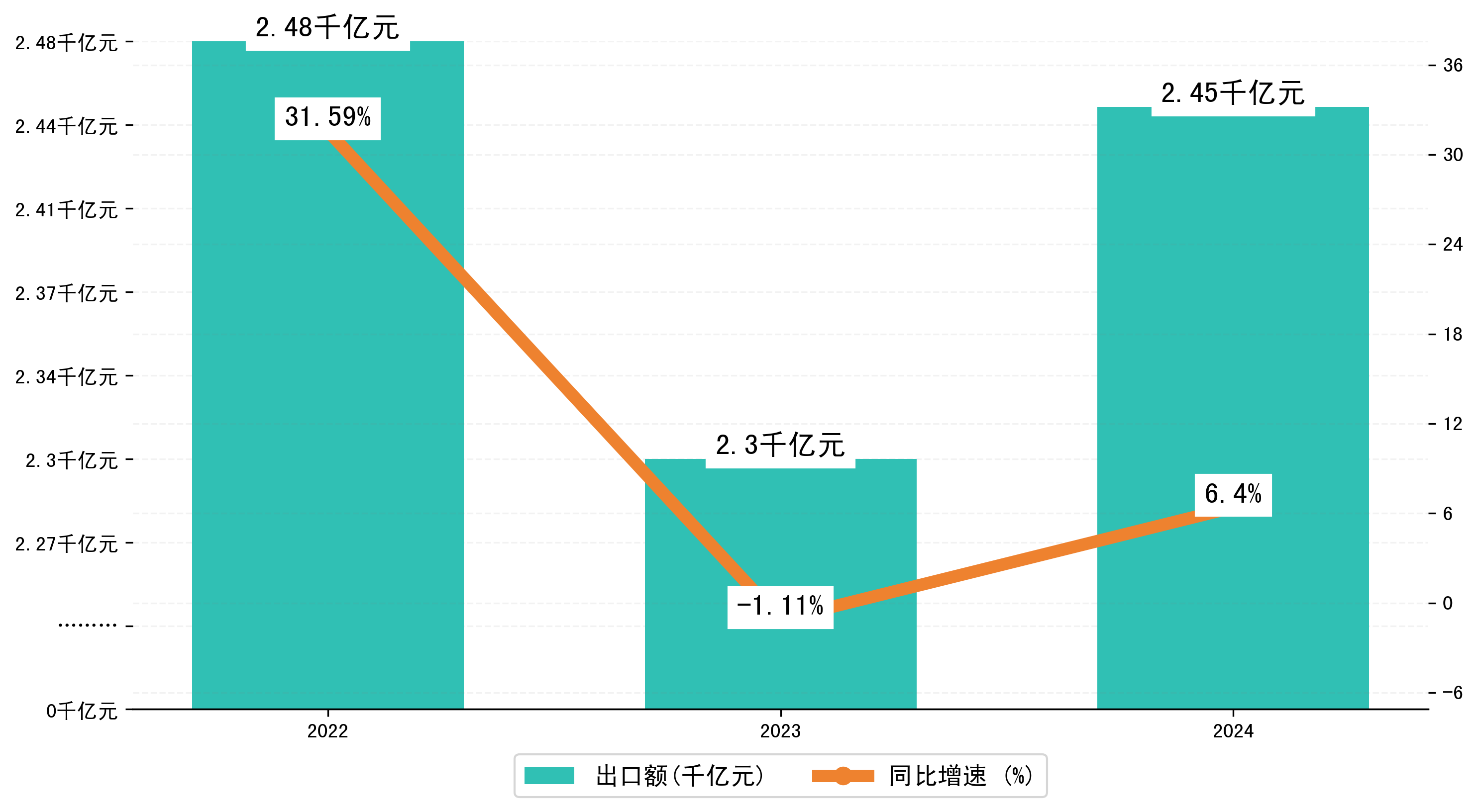以人民币计,2024年1-12月潍坊市出口额为2449,7229.6334万元,相比上年同期增加了147,3825.2537万元,同比增加了6.40%。