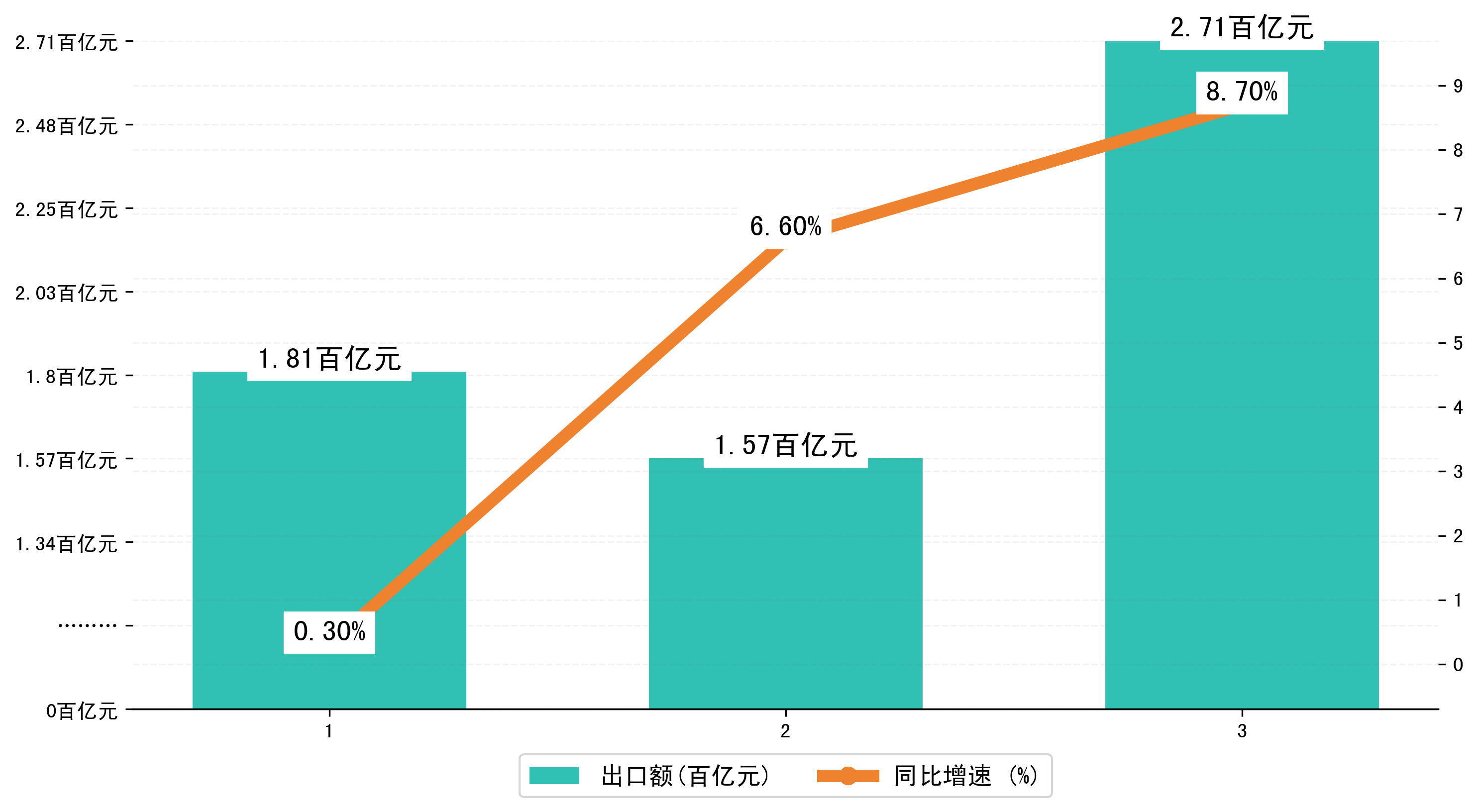 以人民币计,2025年3月潍坊市出口额为270,7058.0531万元,相比上月增加了113,5553.9881万元;相比上年同期增加了27,5659.5572万元,同比增加了8.70%。