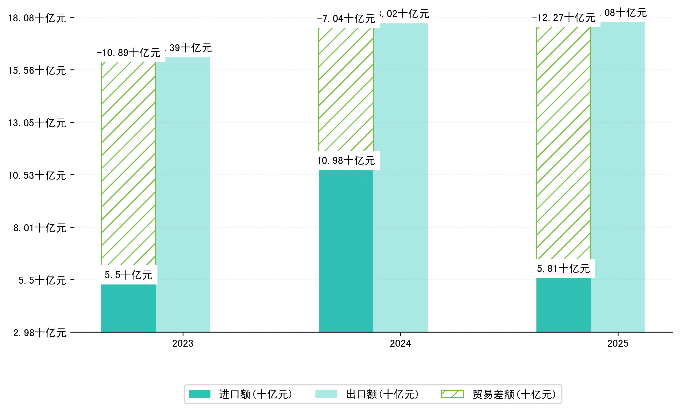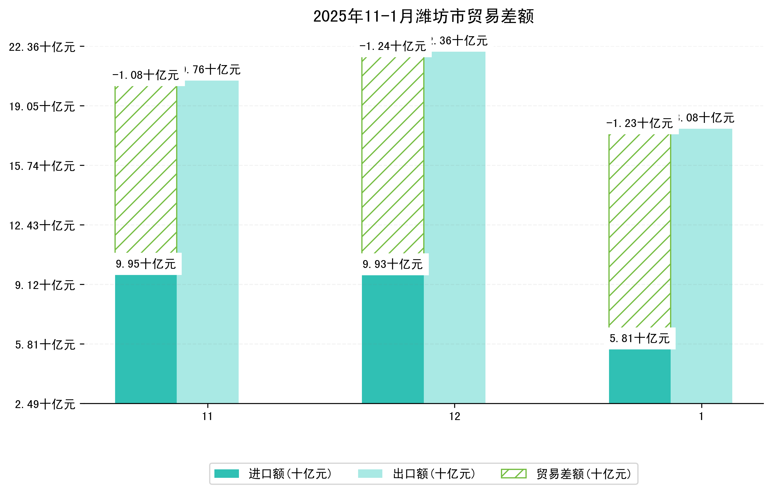 以人民币计,2025年1-1月潍坊市贸易差额为122,7227,3943万元(贸易顺差),相比上年同期增加了52,2843,6239万元,同比增加74.23%。