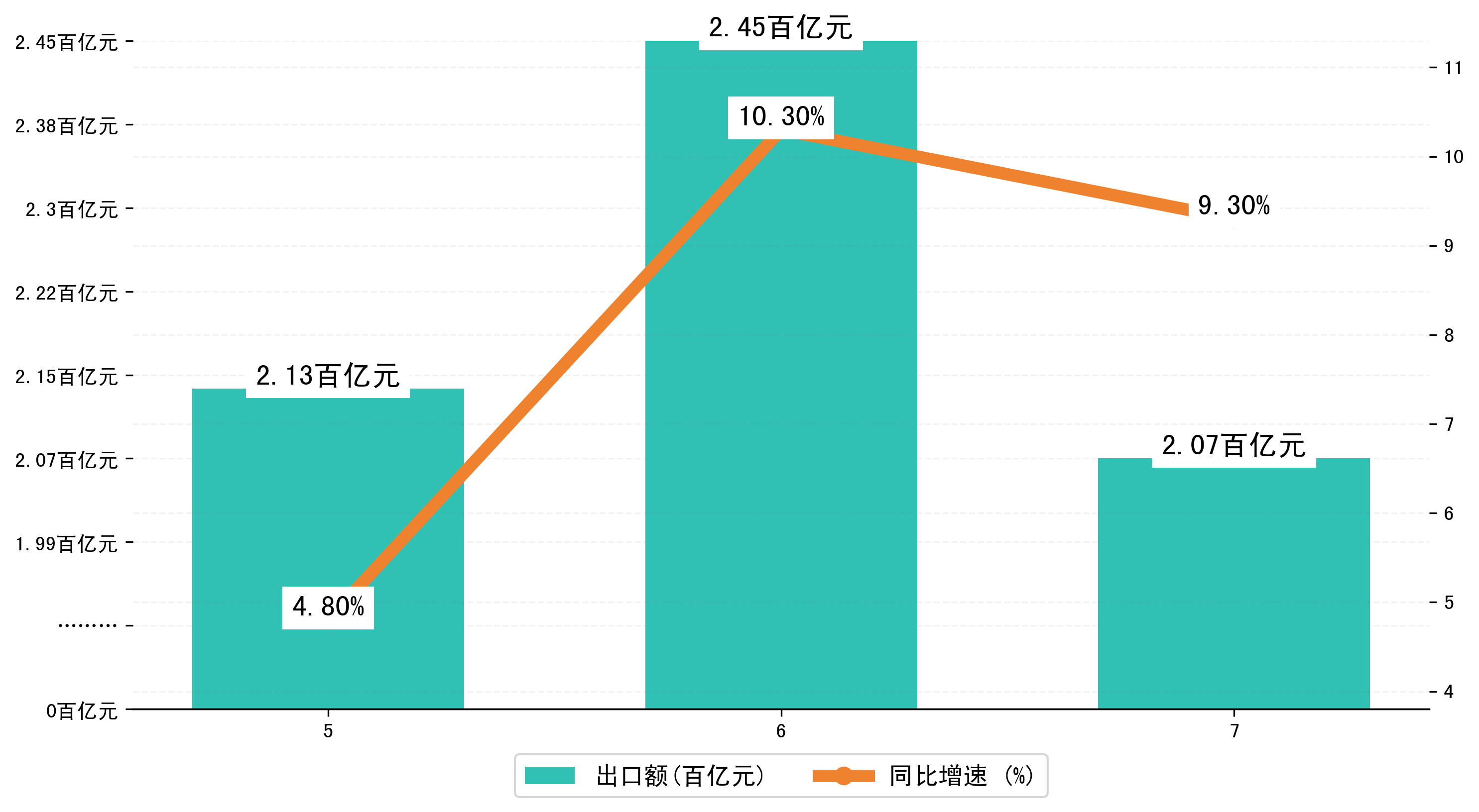 以人民币计,2025年7月潍坊市出口额为207,0078.4074万元,相比上月减少了38,1492.3616万元;相比上年同期增加了6,9464.7331万元,同比增加了9.30%。