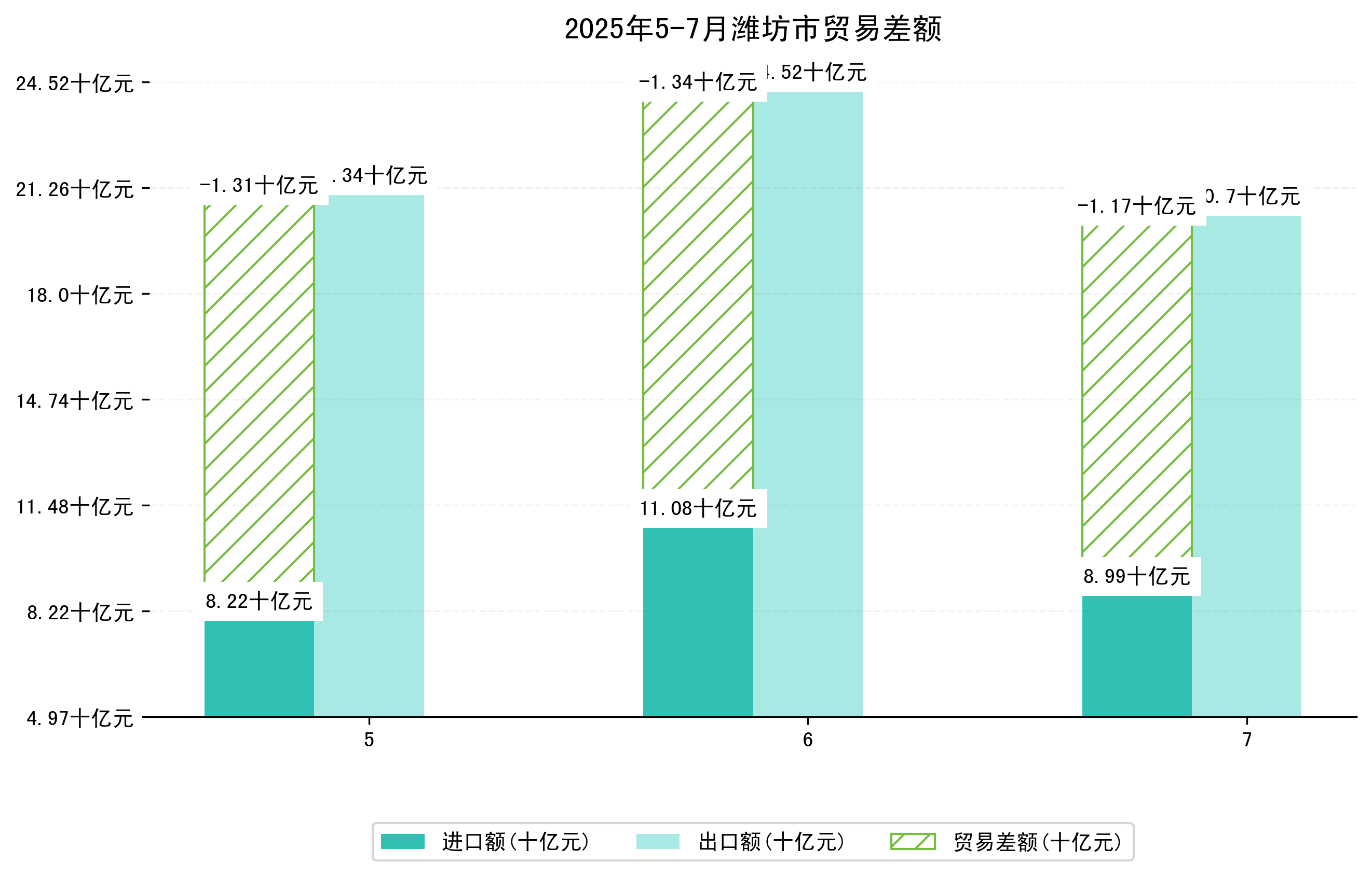 以人民币计,2025年1-7月潍坊市贸易差额为796,7638,8142万元(贸易顺差),相比上年同期增加了25,5573,4124万元,同比增加3.31%。