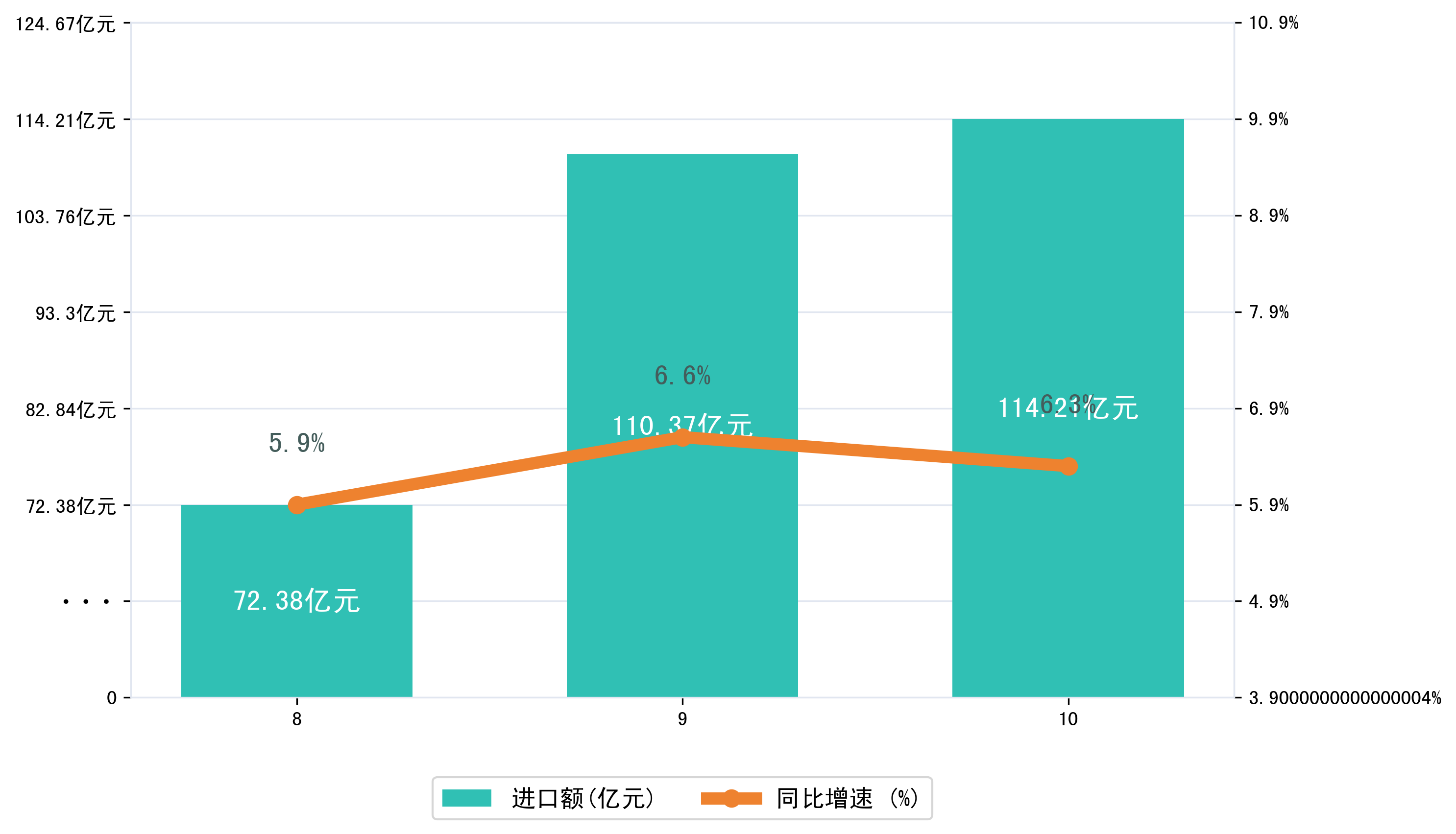 以人民币计,2025年10月潍坊市进口额为114,2124.661万元,相比上月增加了3,8462.6906万元;相比上年同期增加了4,0977.6429万元,同比增加了6.30%。