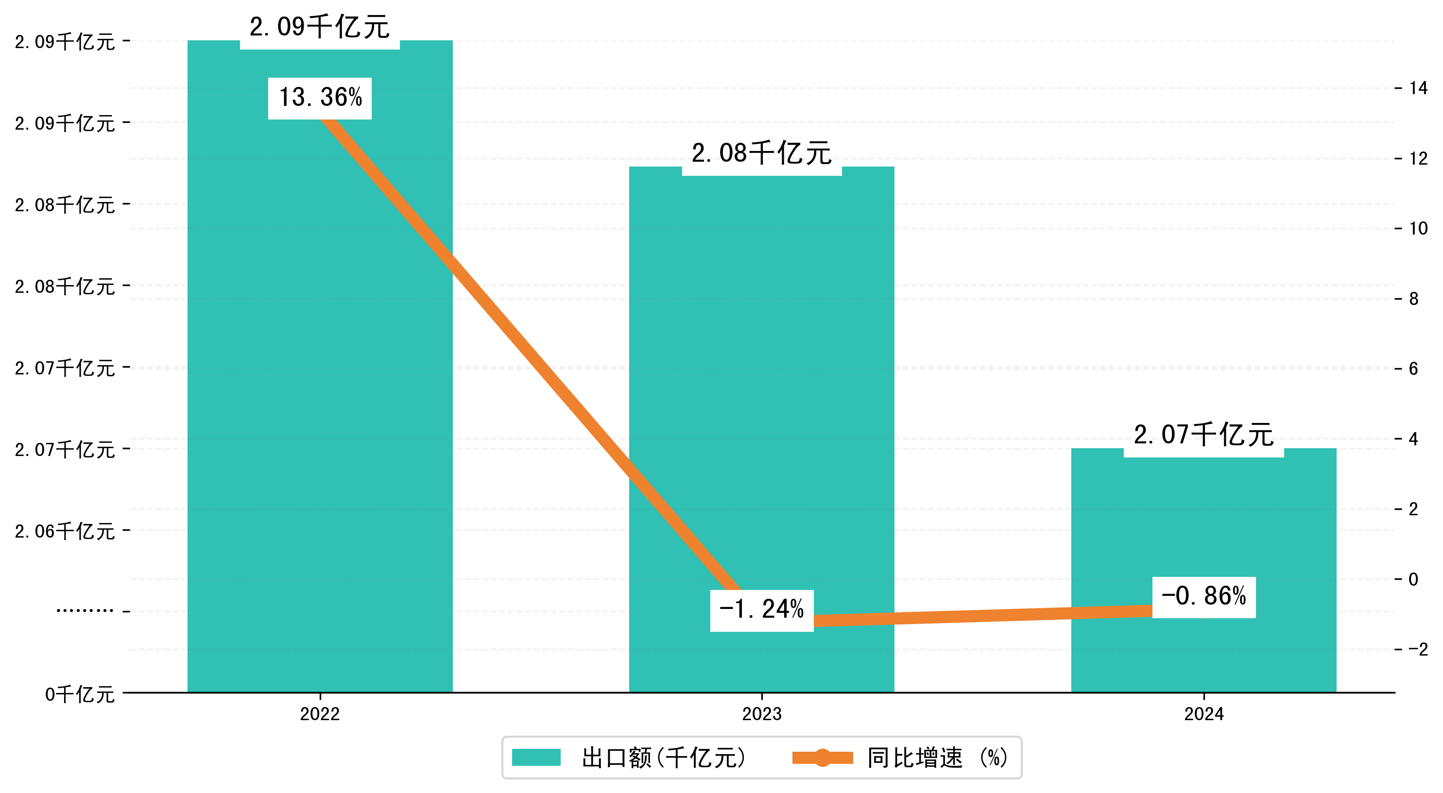 以美元计,2024年1-7月辽宁省出口额为290,7427.387万美元,相比上年同期减少了9,7863.1302万美元,同比减少-3.10%。
