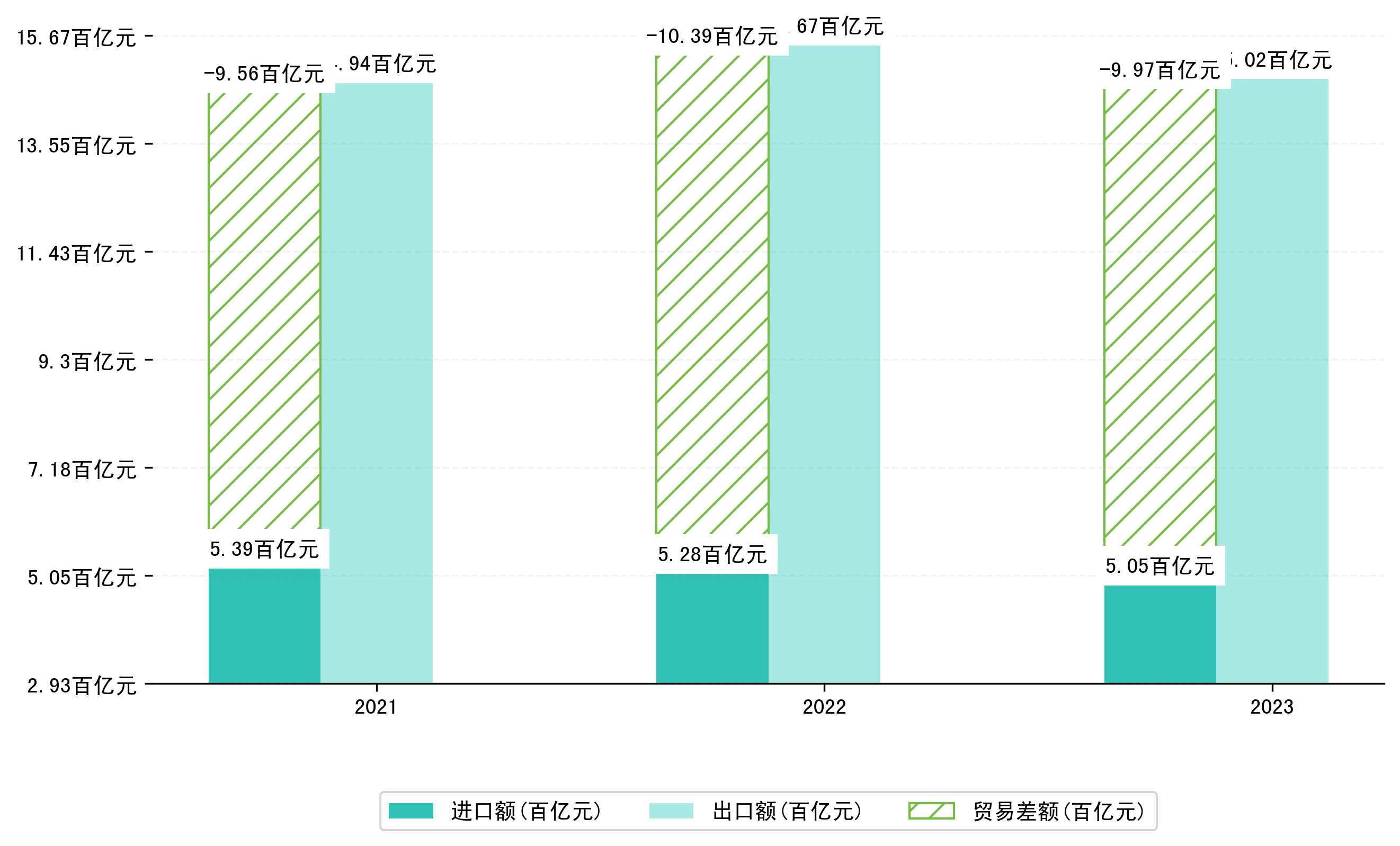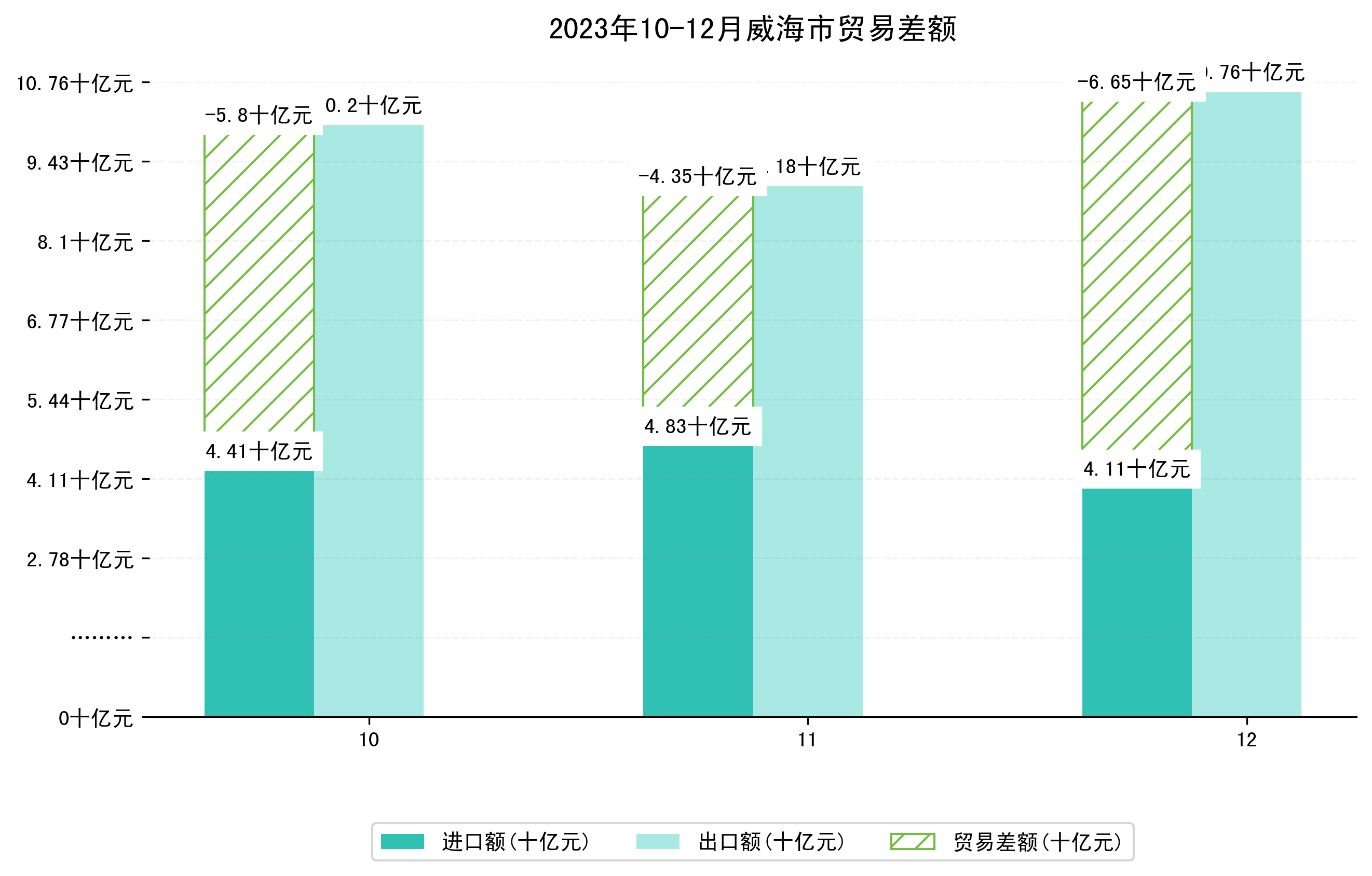 以人民币计,2023年12月威海市贸易差额为66,5051,8492万元(贸易顺差),相比上月增加了22,9906,3146万元,即3,2148,9519万美元;相比上年同期增加了7,1297,4583万元,同比增加12.01%。