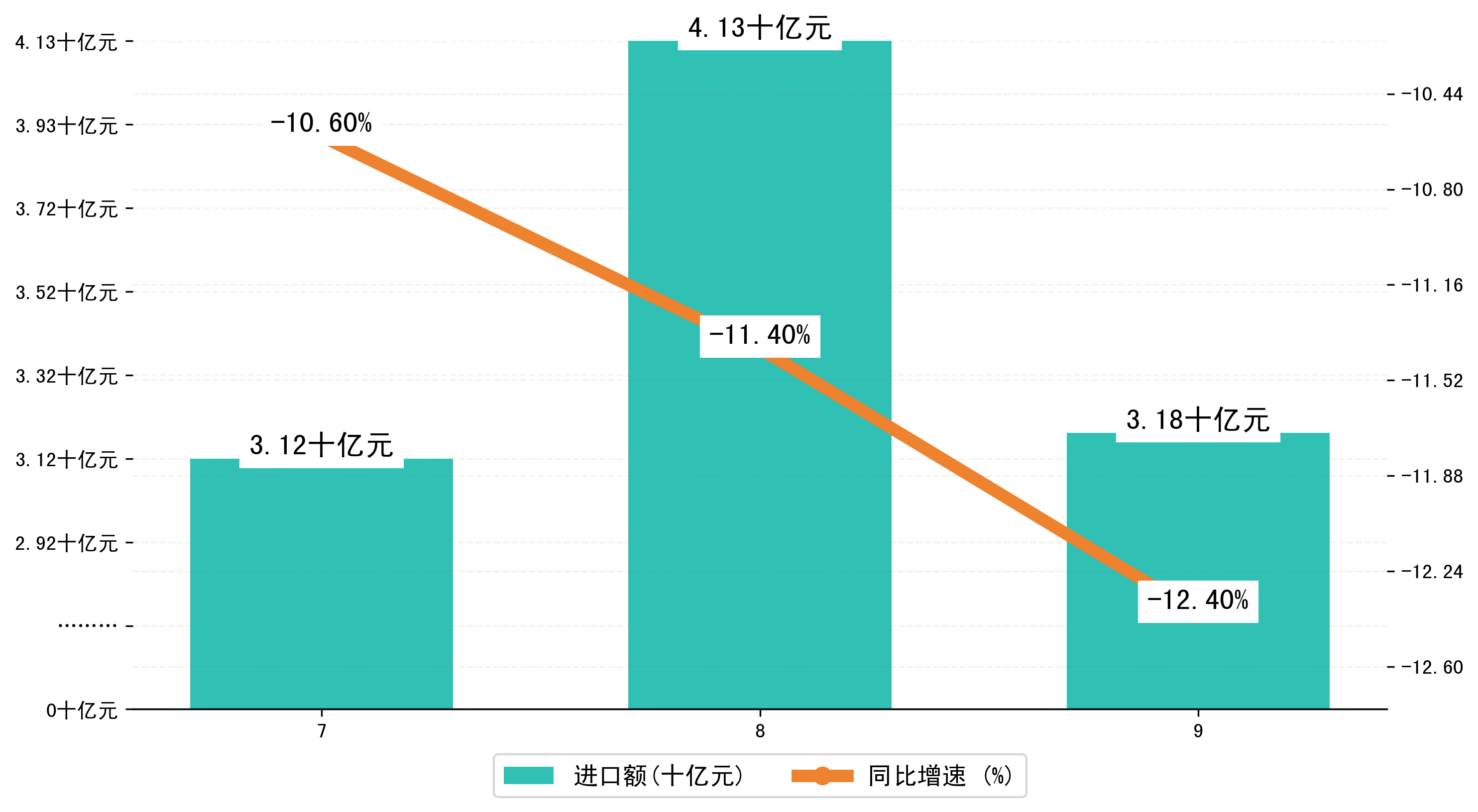 以人民币计,2024年9月威海市进口额为31,8150.3974万元,相比上月减少了9,4574.4163万元;相比上年同期减少了7,9851.3468万元,同比减少了-12.40%。