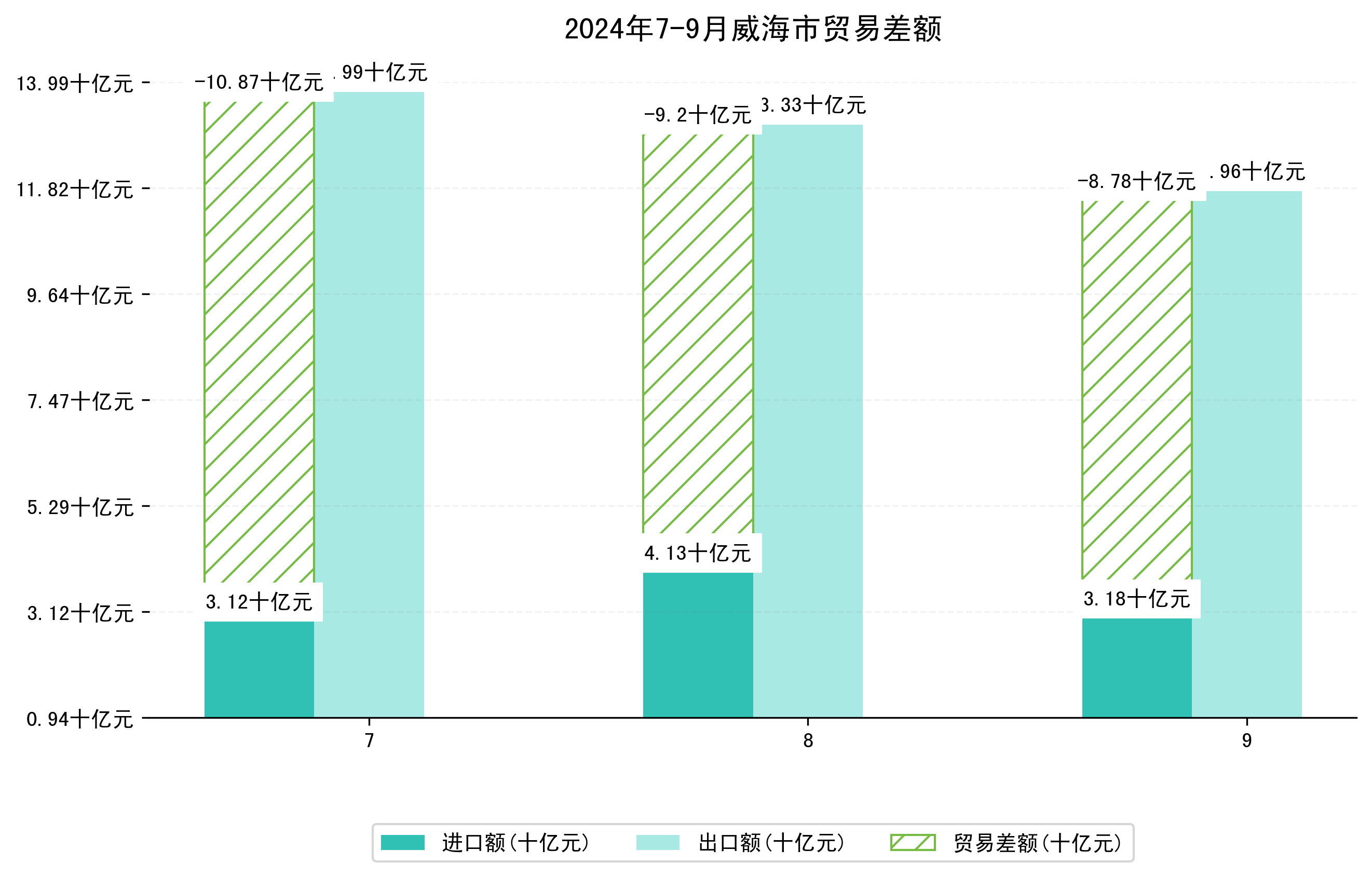 以人民币计,2024年1-9月威海市贸易差额为828,5894,2980万元(贸易顺差),相比上年同期减少了4,2526,5628万元,同比减少-0.51%。