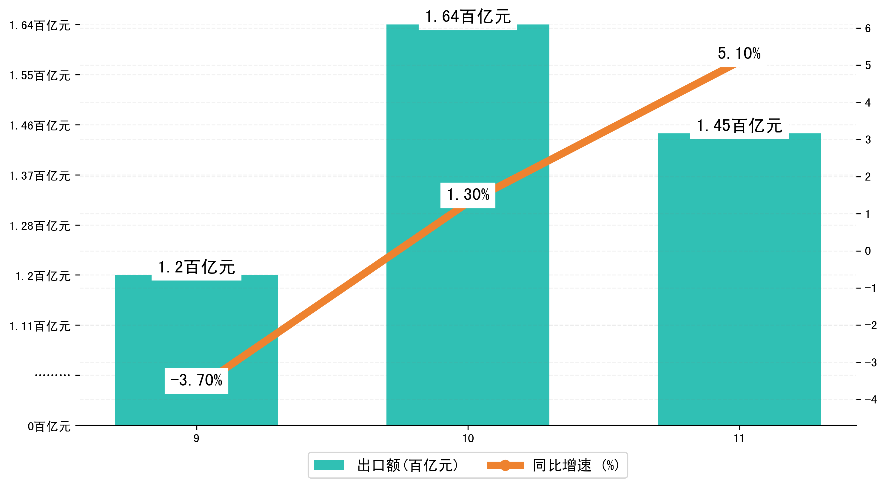 以人民币计,2024年1-11月威海市出口额为1464,5522.4584万元,相比上年同期增加了70,4734.0298万元,同比增加了5.10%。