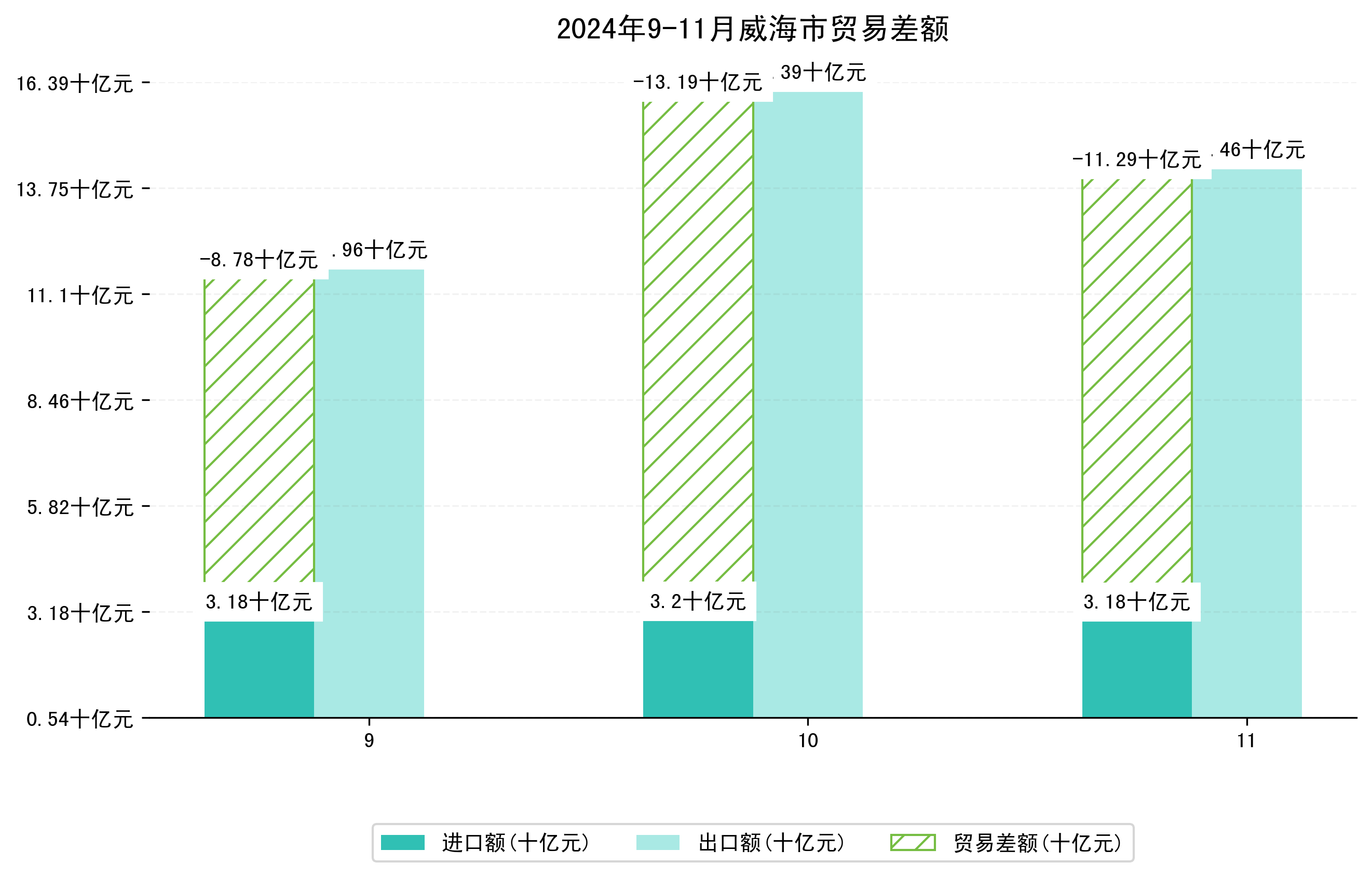 以美元计,2024年1-11月威海市贸易差额为151,0593,3748万美元(贸易顺差),相比上年同期增加了18,3239,6328万美元,同比增加13.8%。