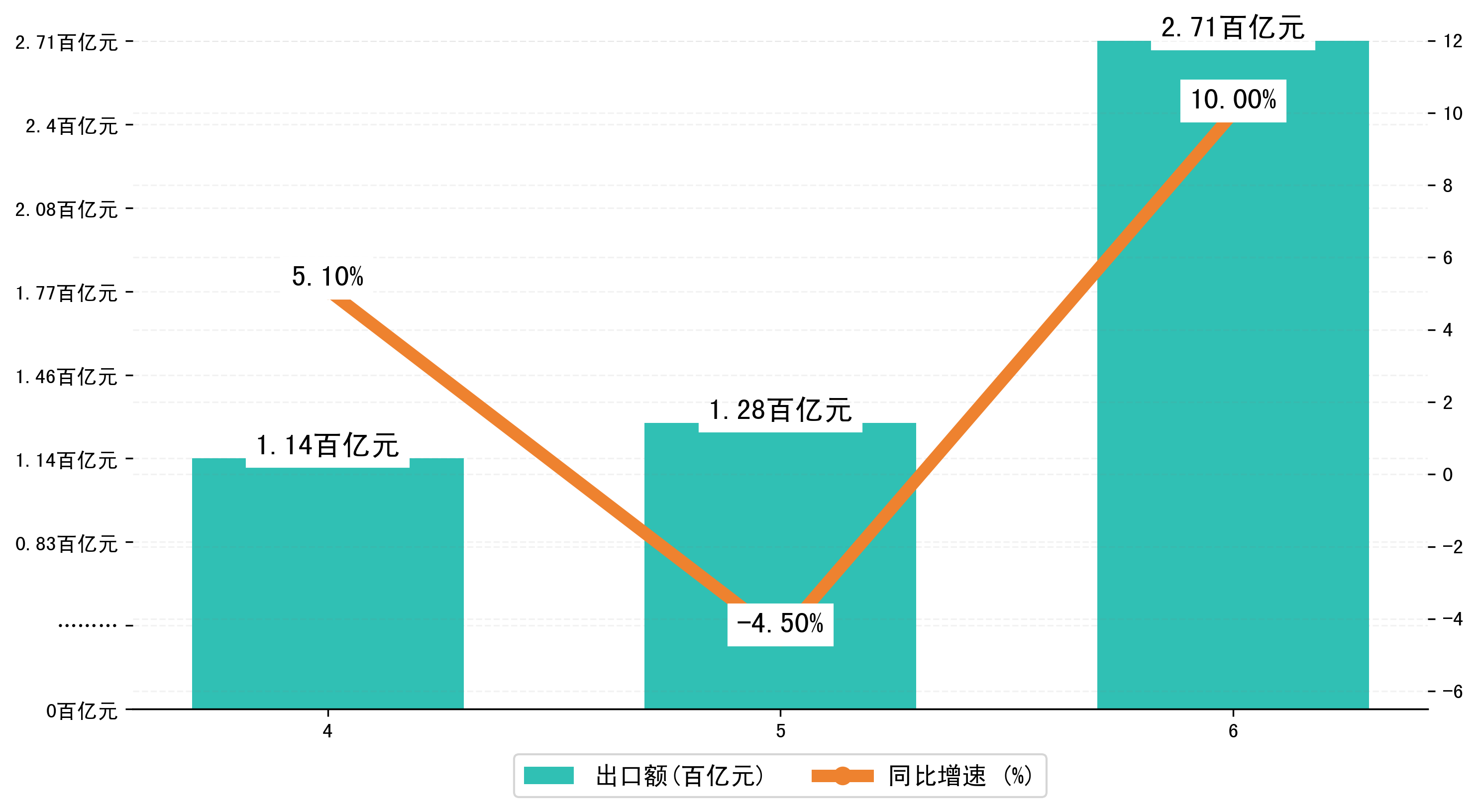 以人民币计,2023年6月威海市出口额为271,2050.7975万元,相比上月增加了143,6496.992万元;相比上年同期增加了97,1216.9759万元,同比增加了10.00%。