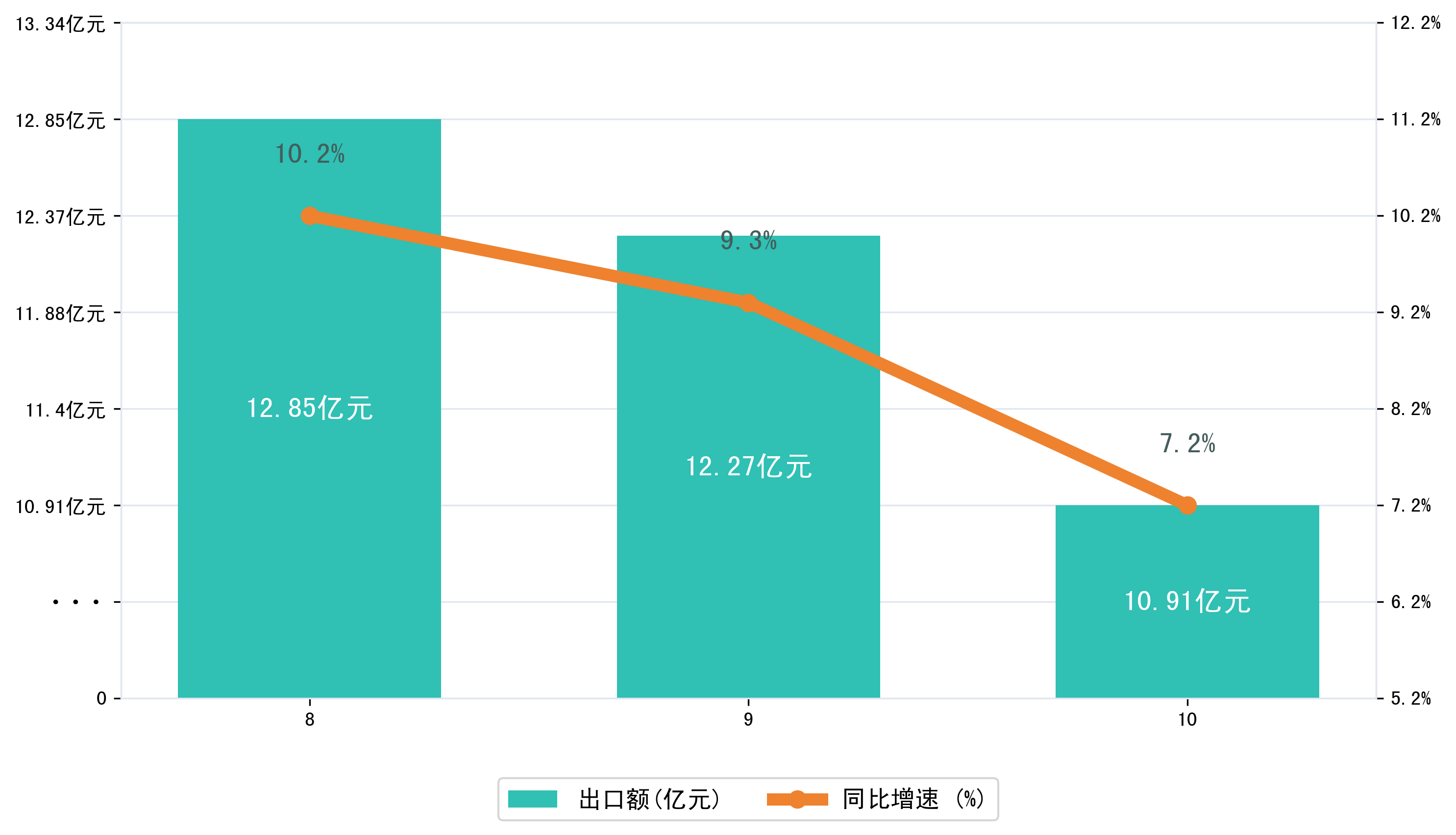 以人民币计,2025年1-10月宁夏回族自治区出口额为127,8333.6665万元,相比上年同期增加了8,6447.6797万元,同比增加了7.20%。