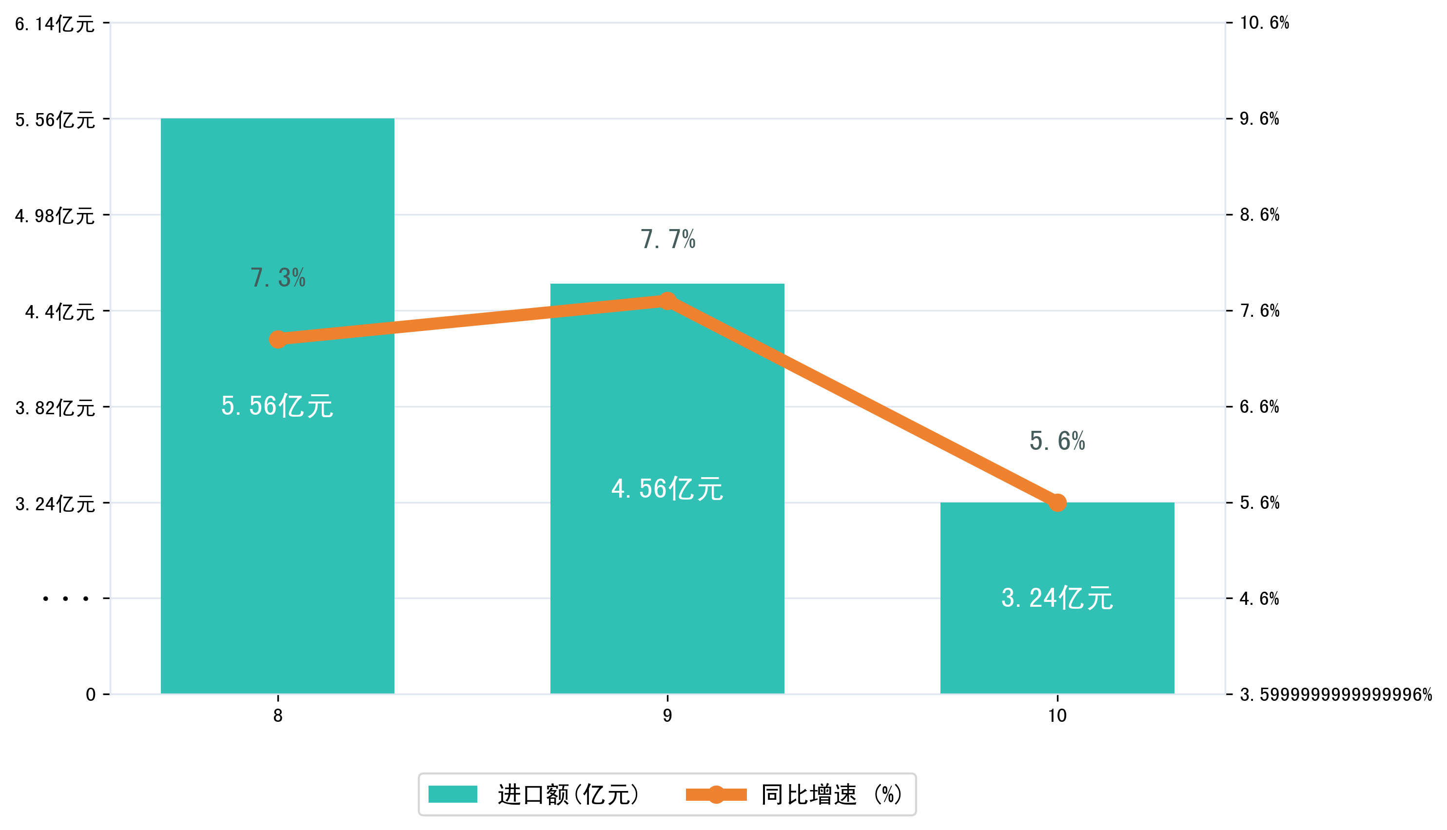 以人民币计,2025年1-10月宁夏回族自治区进口额为46,2458.0971万元,相比上年同期增加了5964.6531万元,同比增加了5.60%。