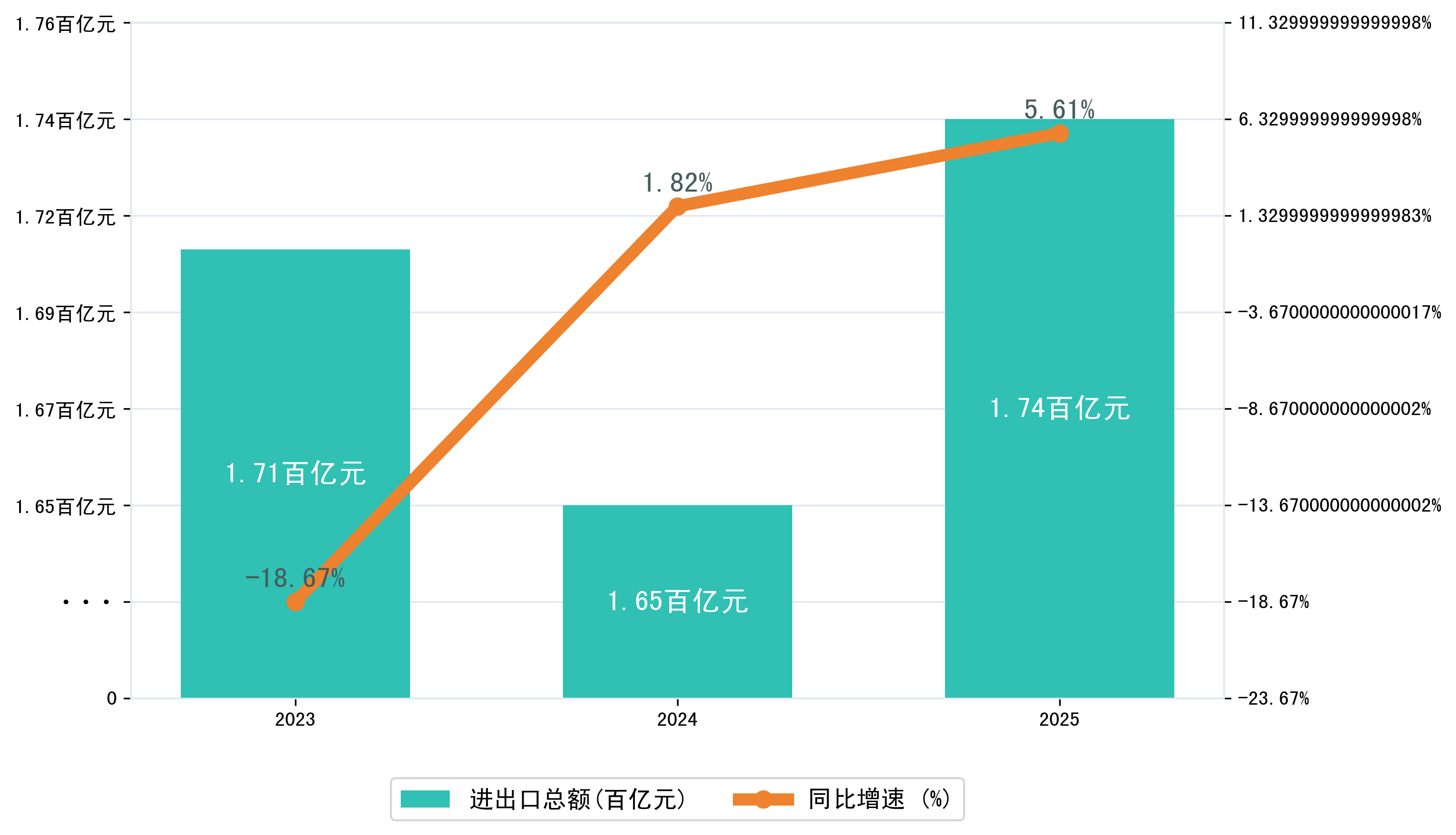 以人民币计,2025年1-10月宁夏回族自治区进出口总额为174,0791.7636万元,相比上年同期增加了9,2412.3327万元,同比增加了6.80%。