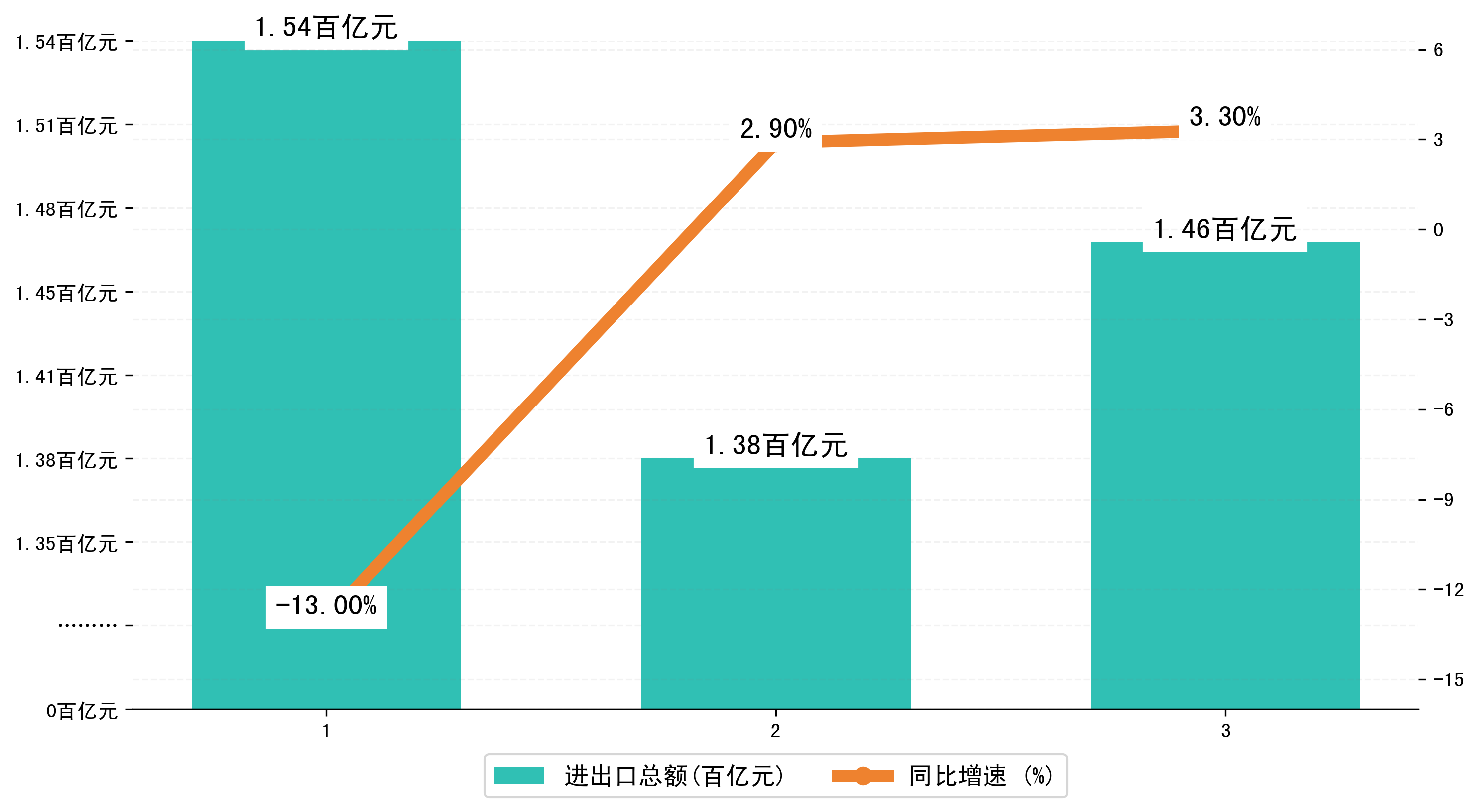 以人民币计,2023年3月威海市进出口总额为146,4579.3401万元,相比上月增加了8,2072.0418万元;相比上年同期增加了6,6100.676万元,同比增加了3.30%。