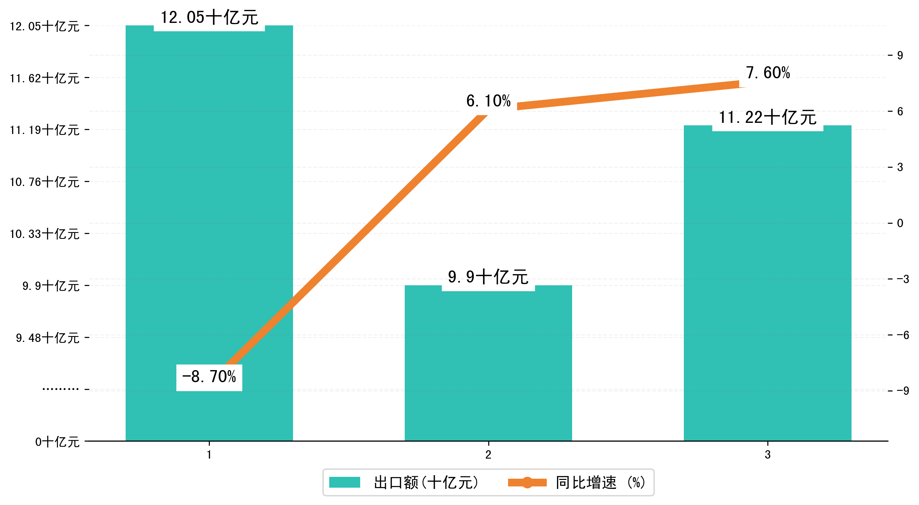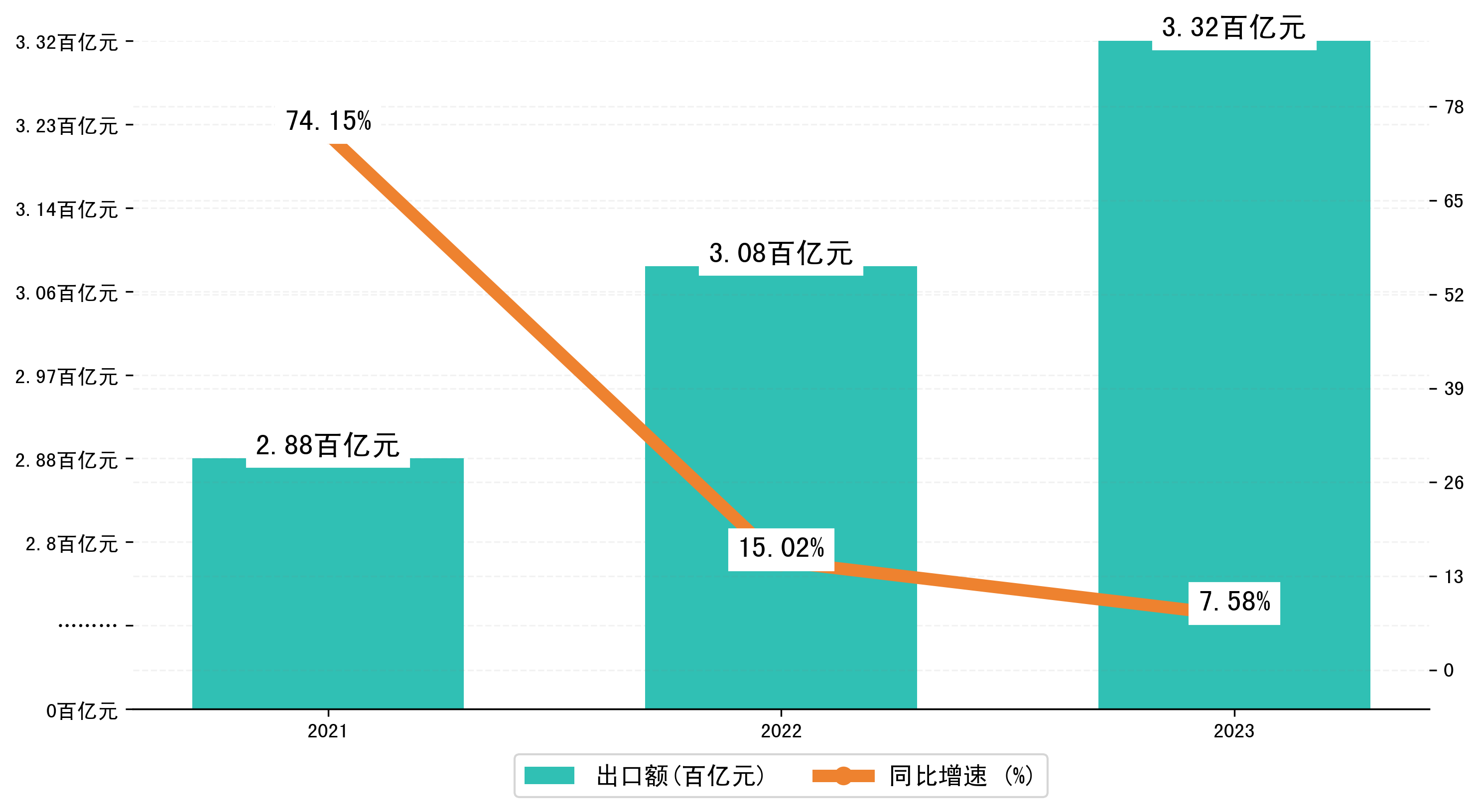 以人民币计,2023年1-3月威海市出口额为331,7198.0604万元,相比上年同期增加了23,3846.5847万元,同比增加了7.60%。