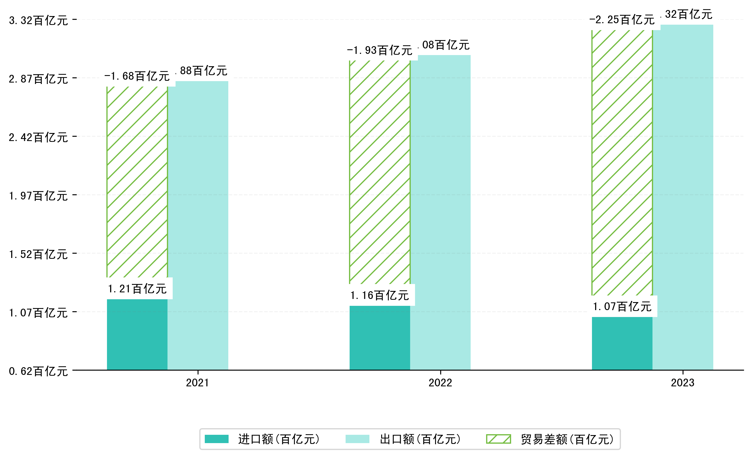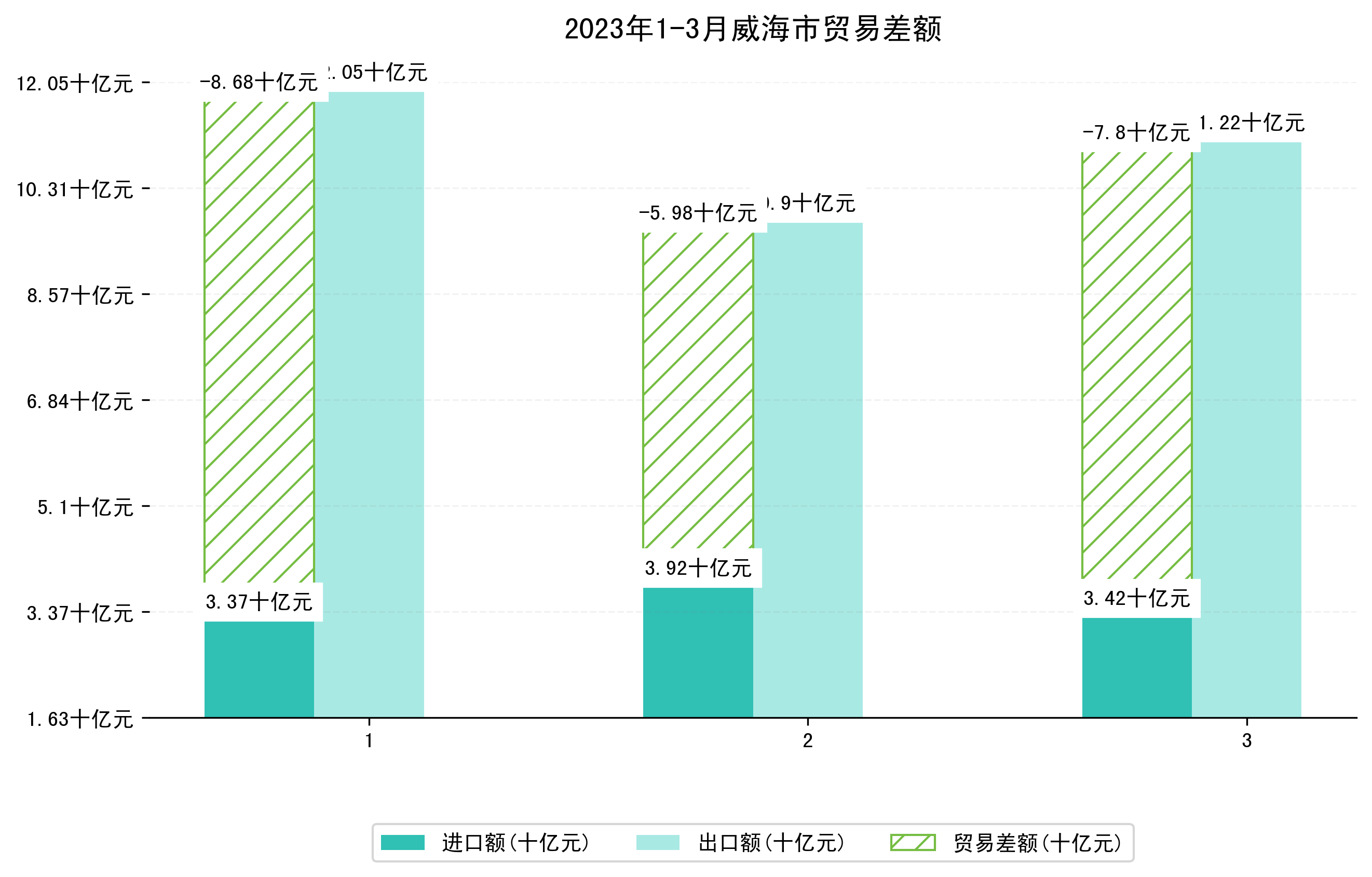 以人民币计,2023年1-3月威海市贸易差额为224,6334,8739万元(贸易顺差),相比上年同期增加了32,0795,0836万元,同比增加16.66%。
