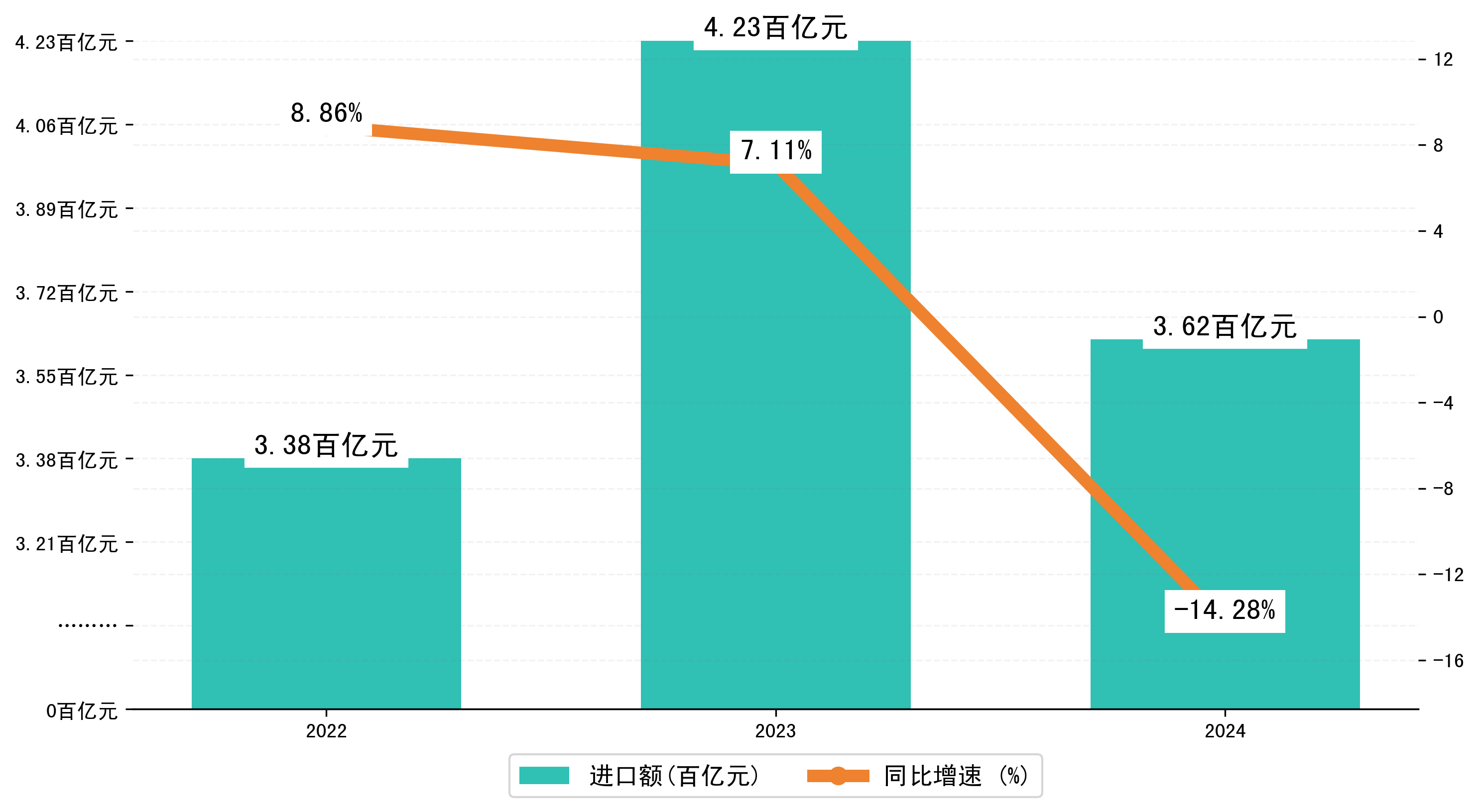 以人民币计,2024年1-10月温州市进口额为362,2940.5008万元,相比上年同期减少了60,3337.623万元,同比减少了-14.20%。