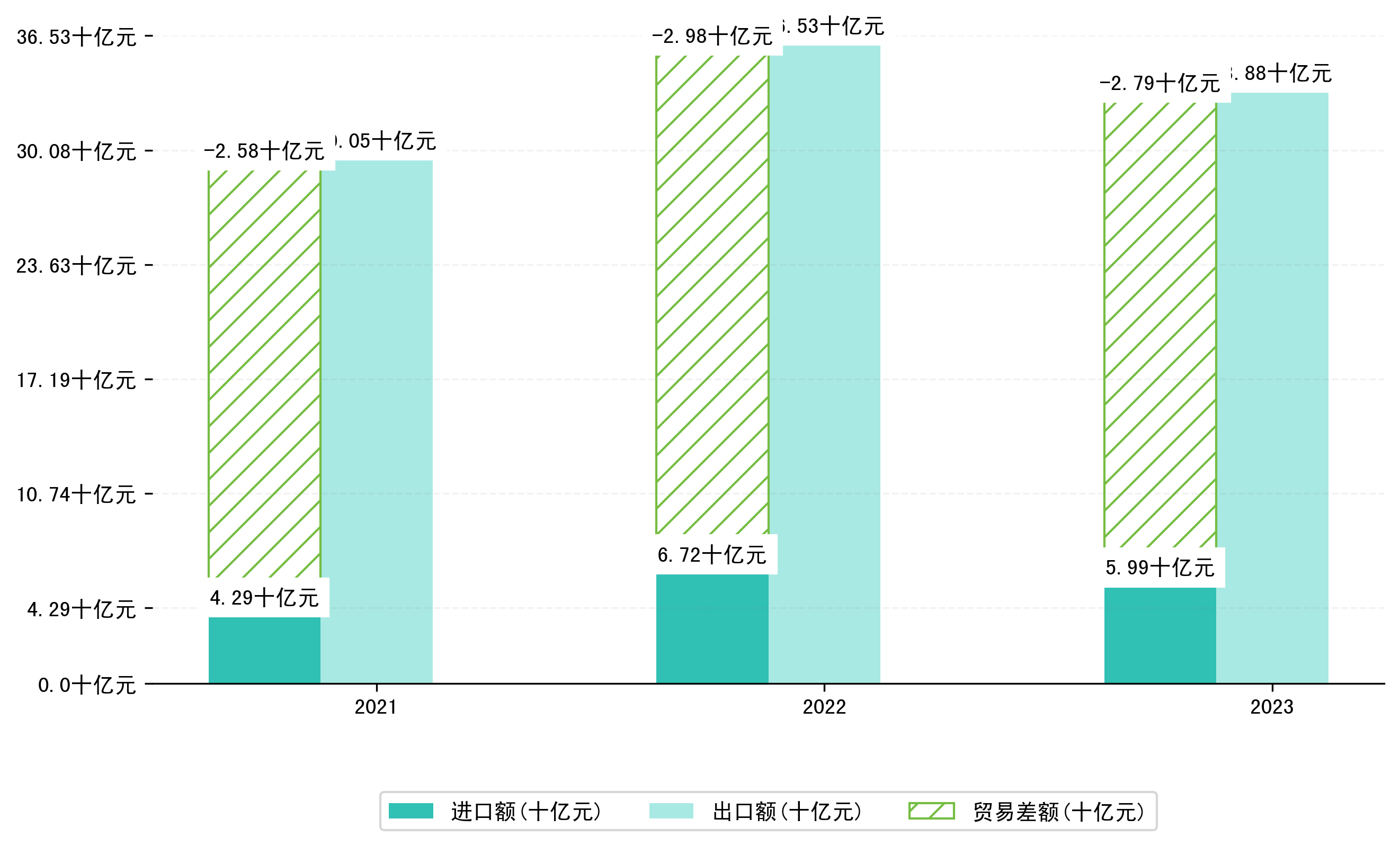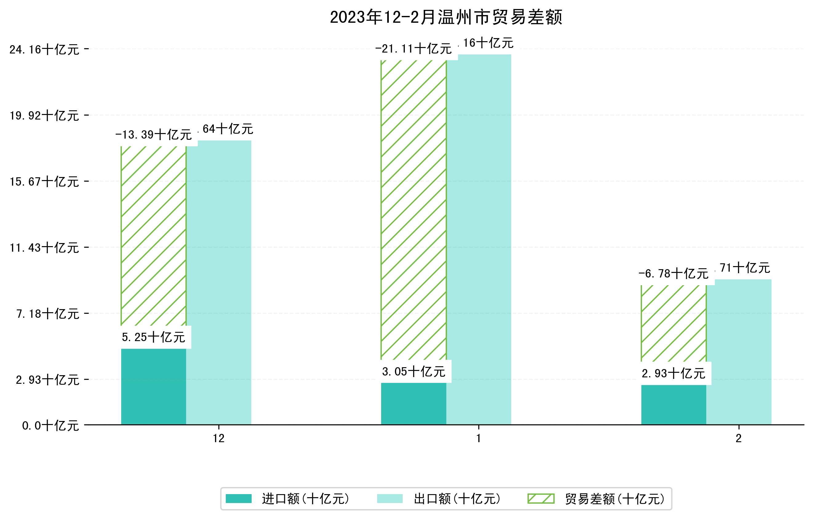 以人民币计,2023年2月温州市贸易差额为67,7830,1925万元(贸易顺差),相比上月减少了143,3227,9922万元,即20,2062,3843万美元;相比上年同期减少了14,5581,8910万元,同比减少-17.68%。