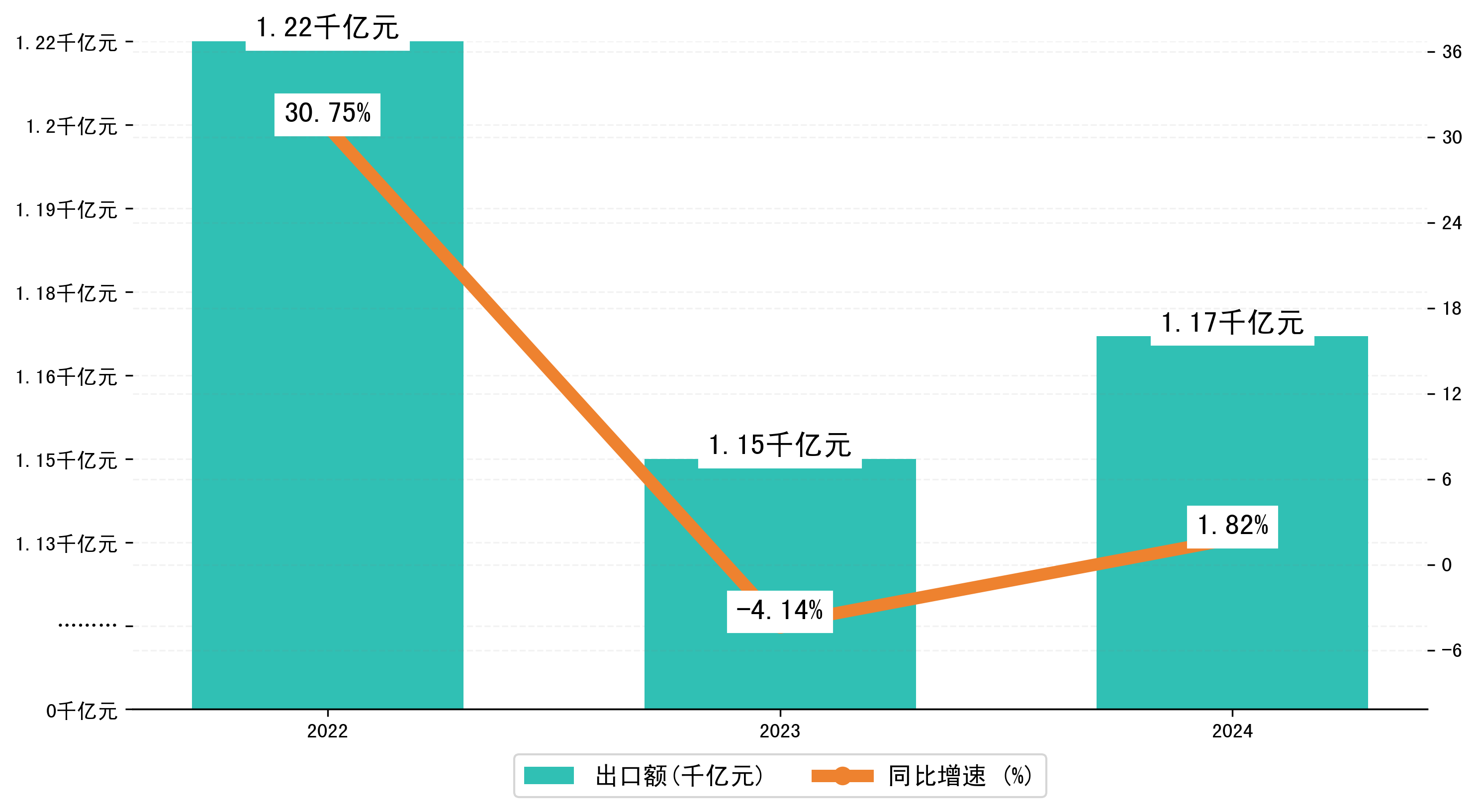 以美元计,2024年1-6月温州市出口额为164,3397.2344万美元,相比上年同期增加了1,8958.1074万美元,同比减少-8.70%。