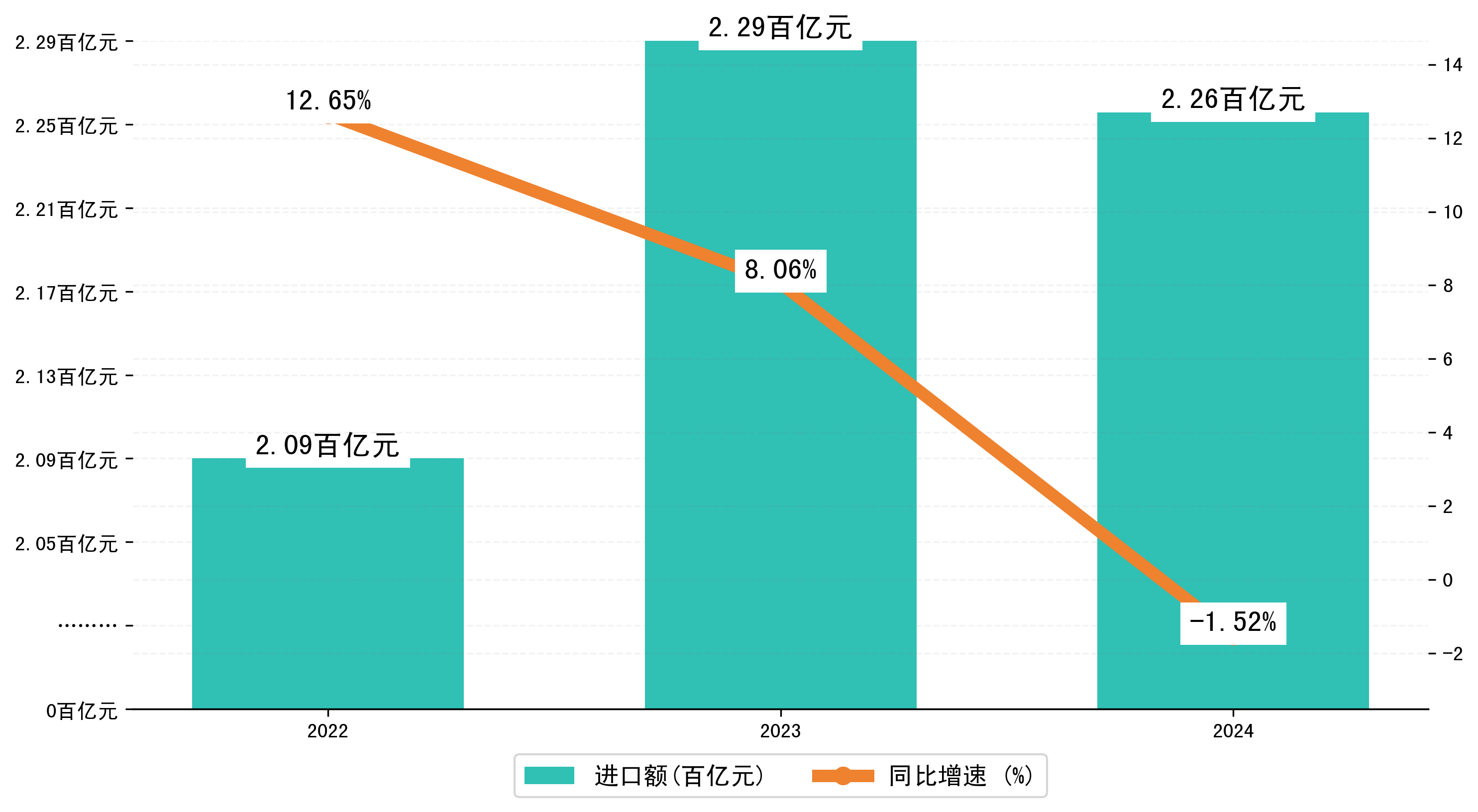 以人民币计,2024年1-6月温州市进口额为225,5359.4262万元,相比上年同期减少了3,4812.9968万元,同比减少了-1.30%。